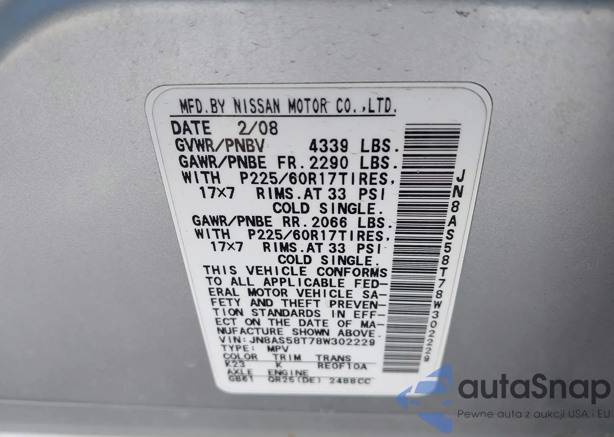 • VIN JN8AS58T78W302229