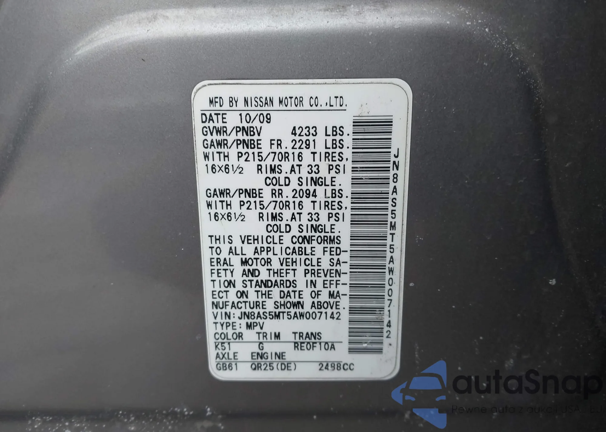 • VIN JN8AS5MT5AW007142