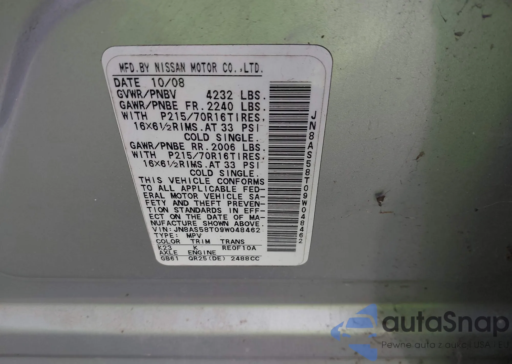 • VIN JN8AS58T09W048462