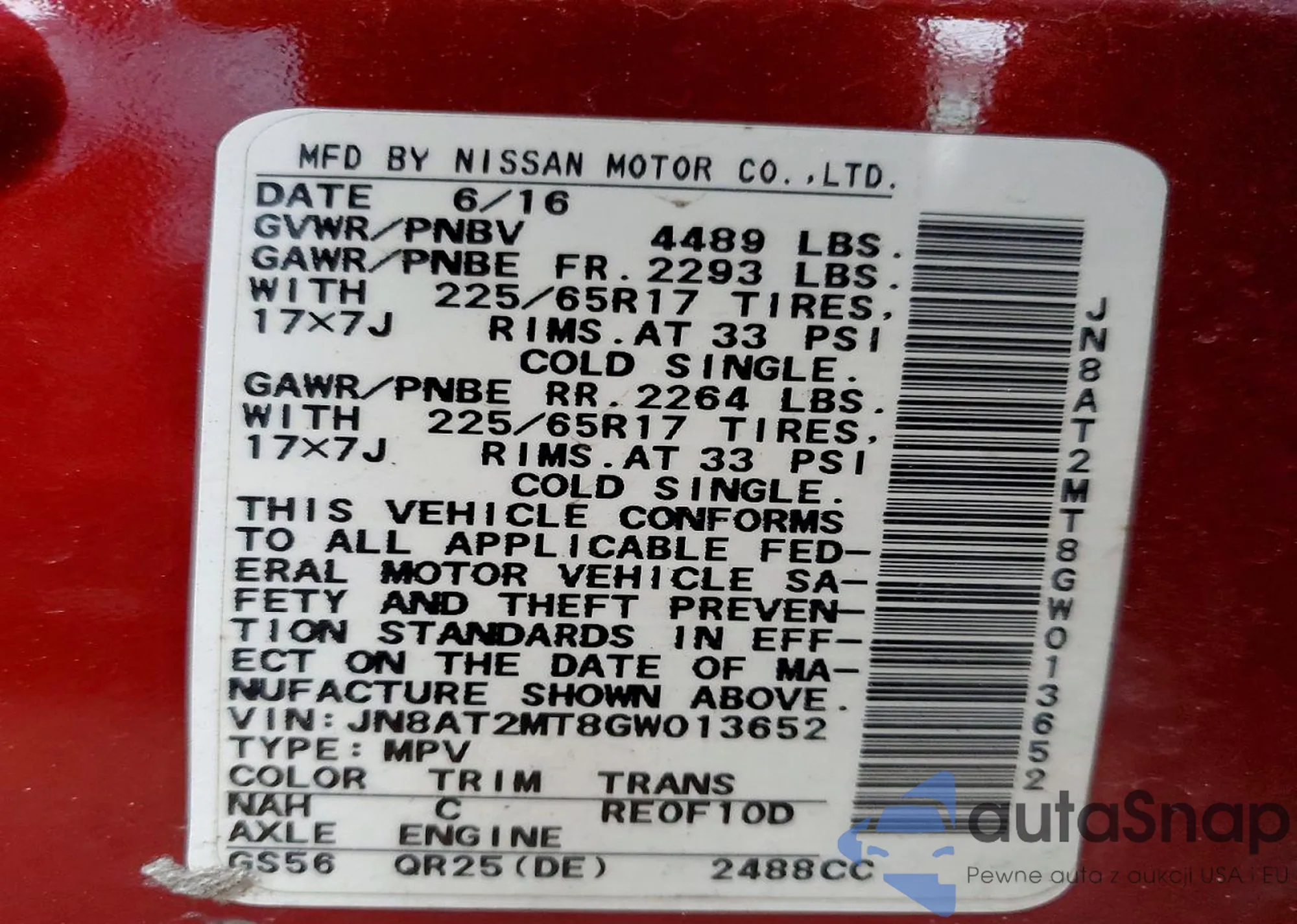 LOT: 46255106 VIN: JN8AT2MT8GW013652