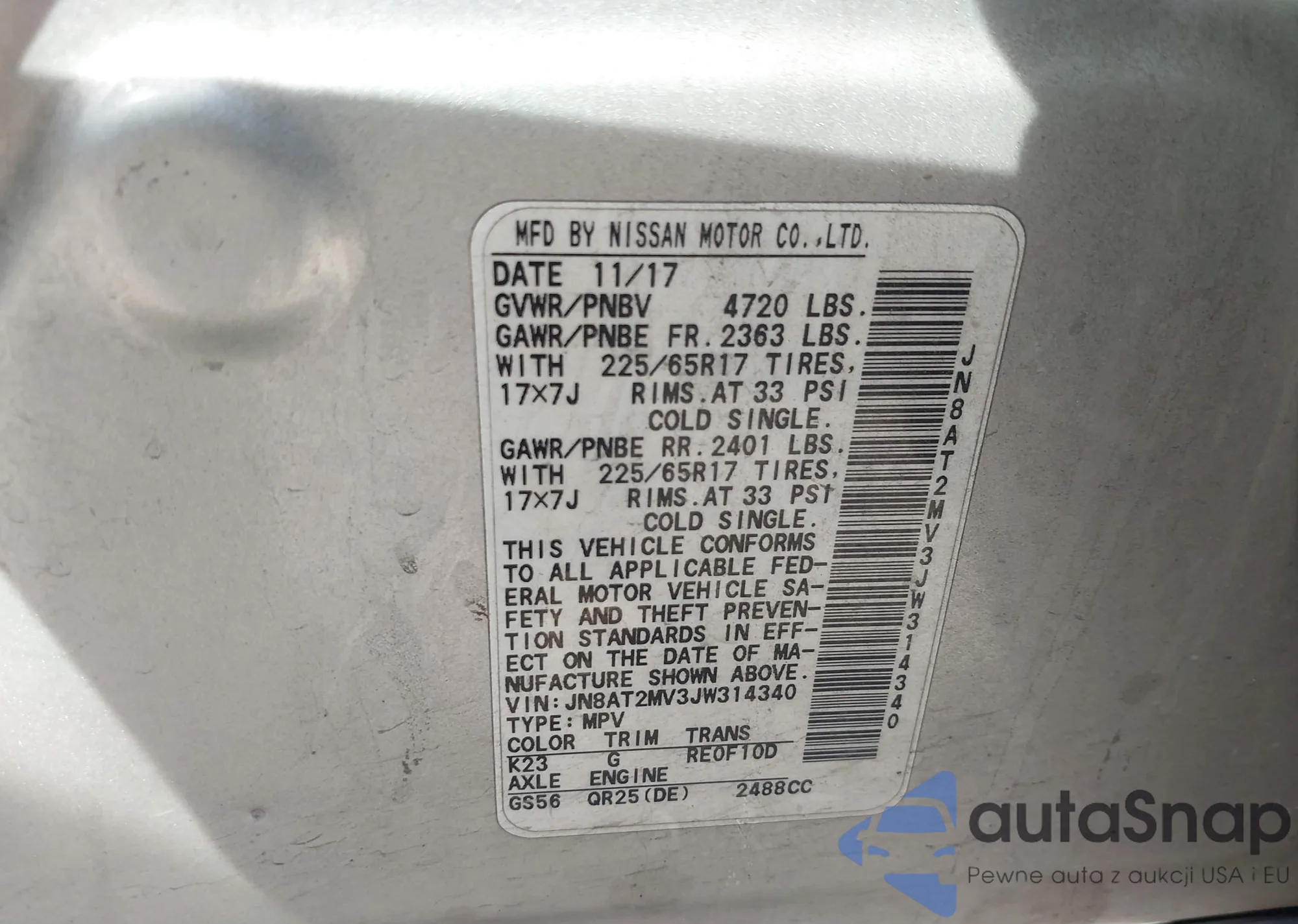 LOT: 43937108 VIN: JN8AT2MV3JW314340