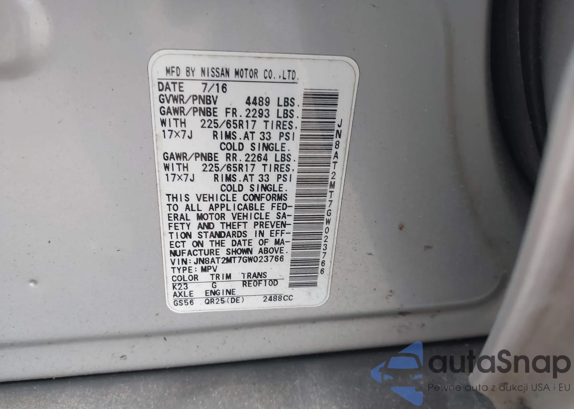 LOT: 44511045 VIN: JN8AT2MT7GW023766