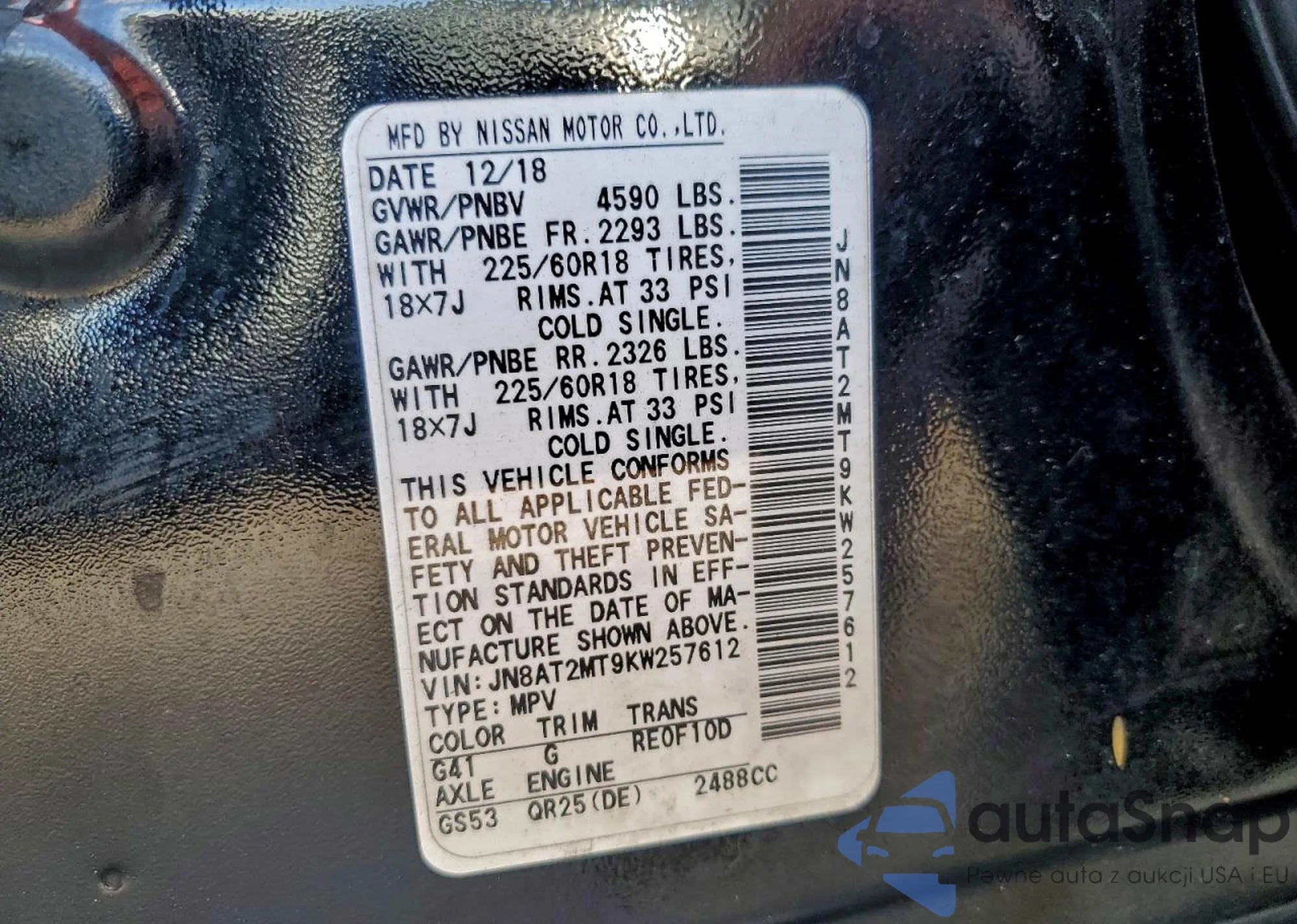 LOT: 95332105 VIN: JN8AT2MT9KW257612