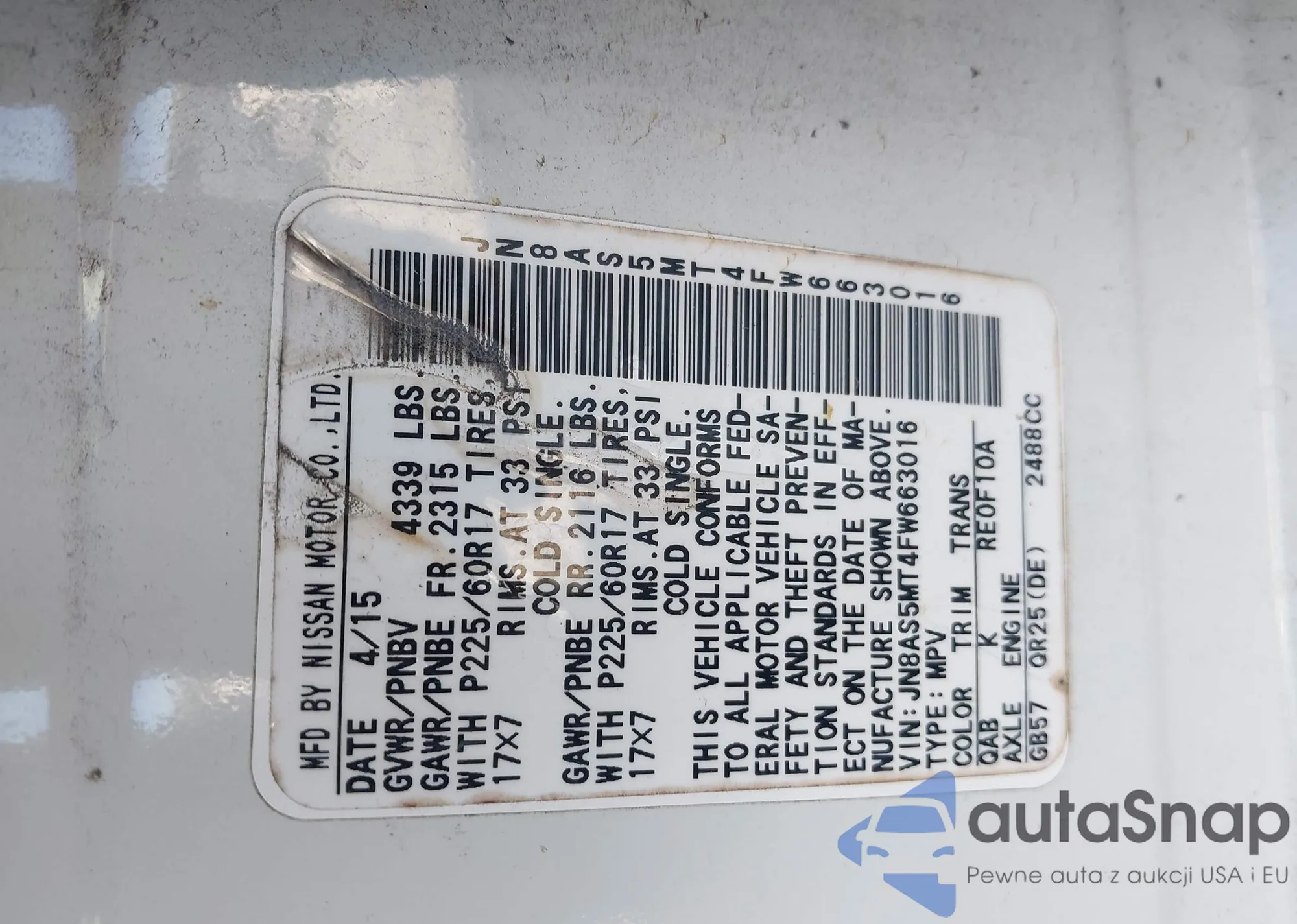 • VIN JN8AS5MT4FW663016