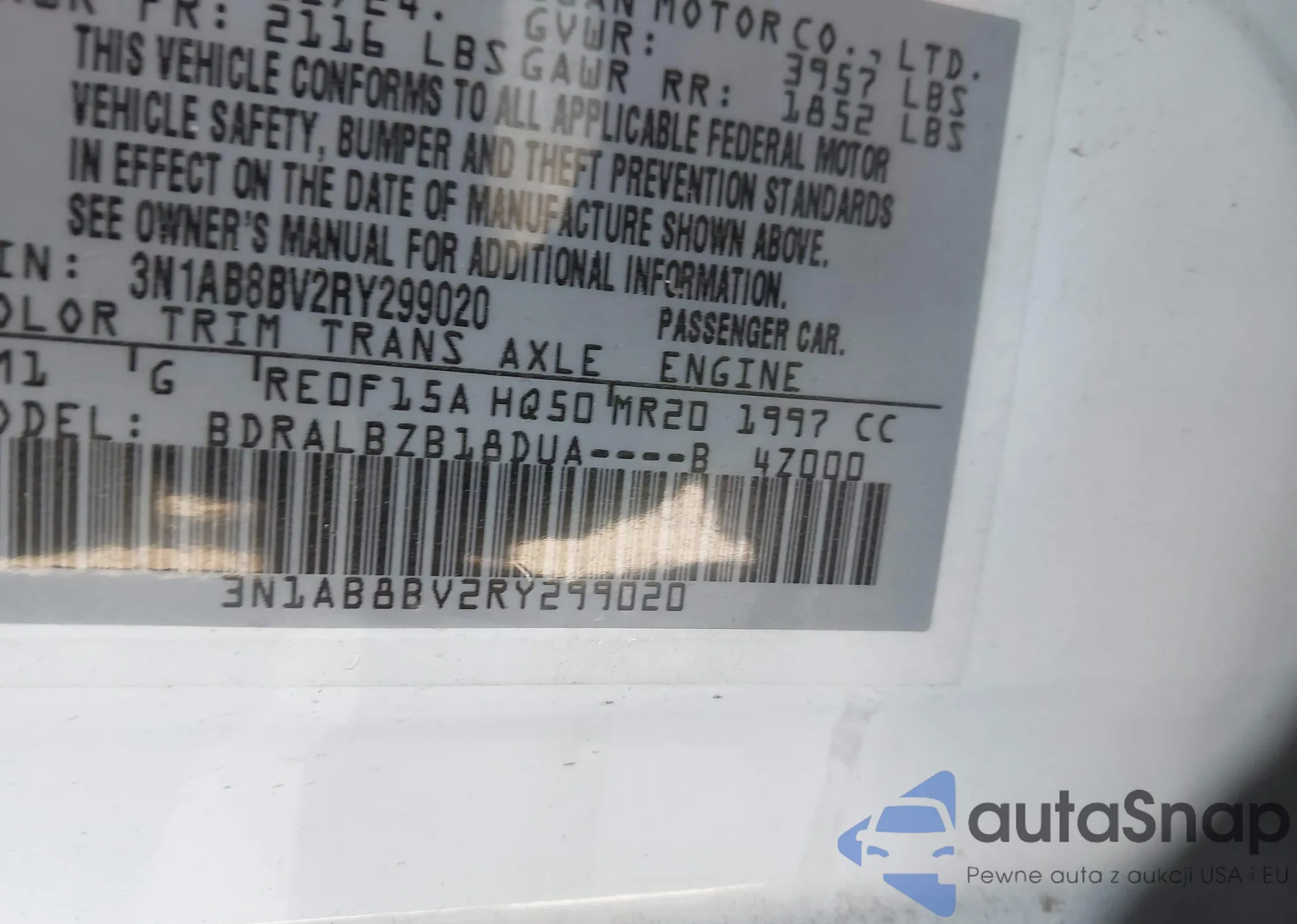 • VIN 3N1AB8BV2RY299020