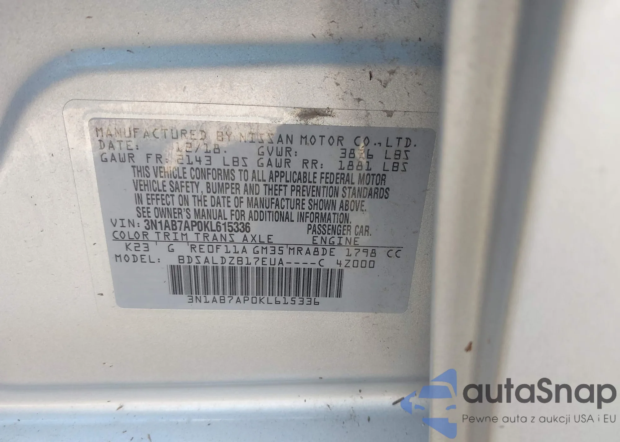 • VIN 3N1AB7AP0KL615336