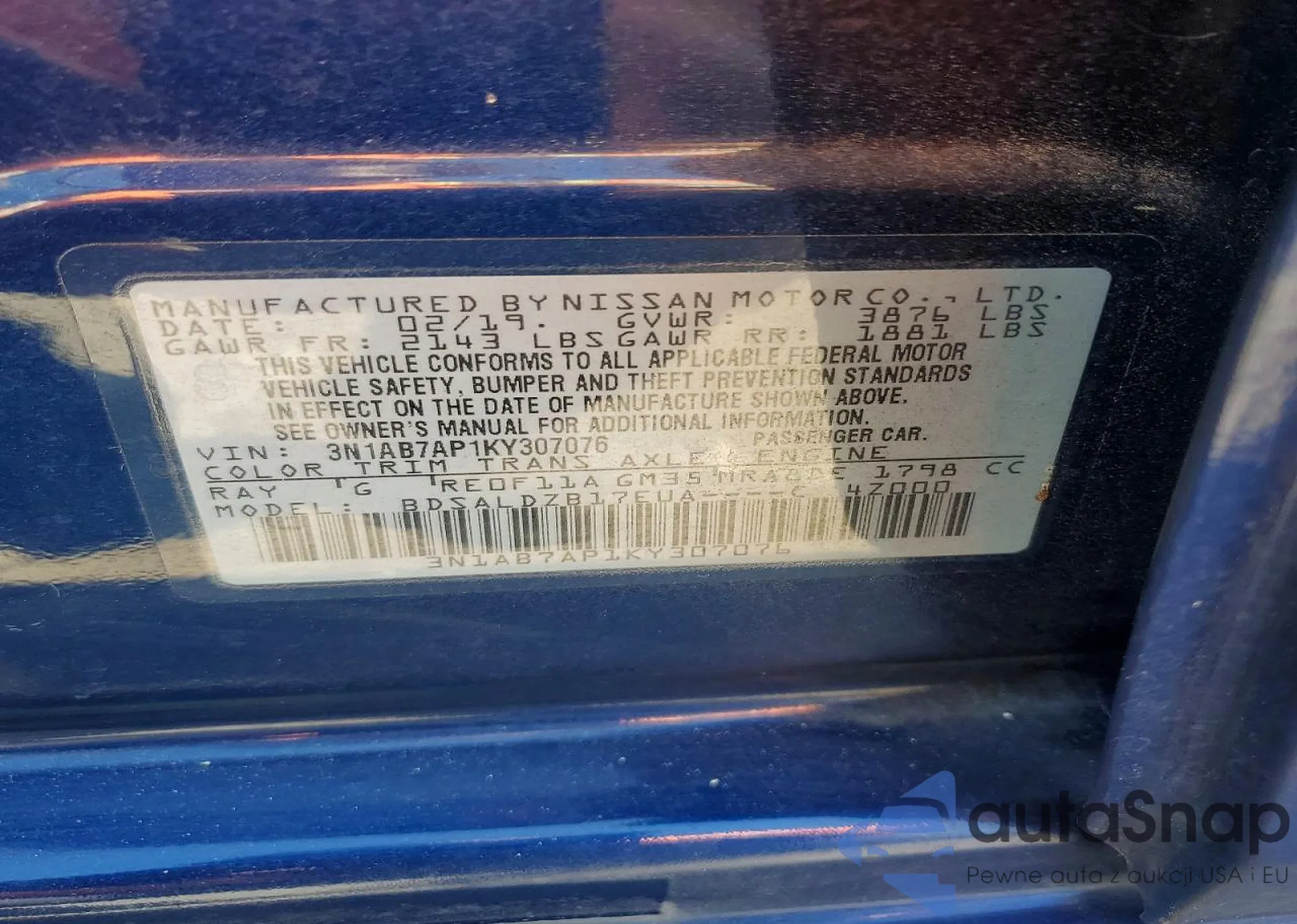 • VIN 3N1AB7AP1KY307076
