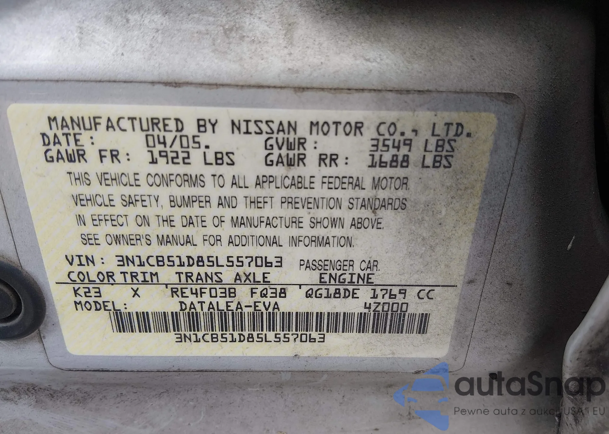 • VIN 3N1CB51D85L557063