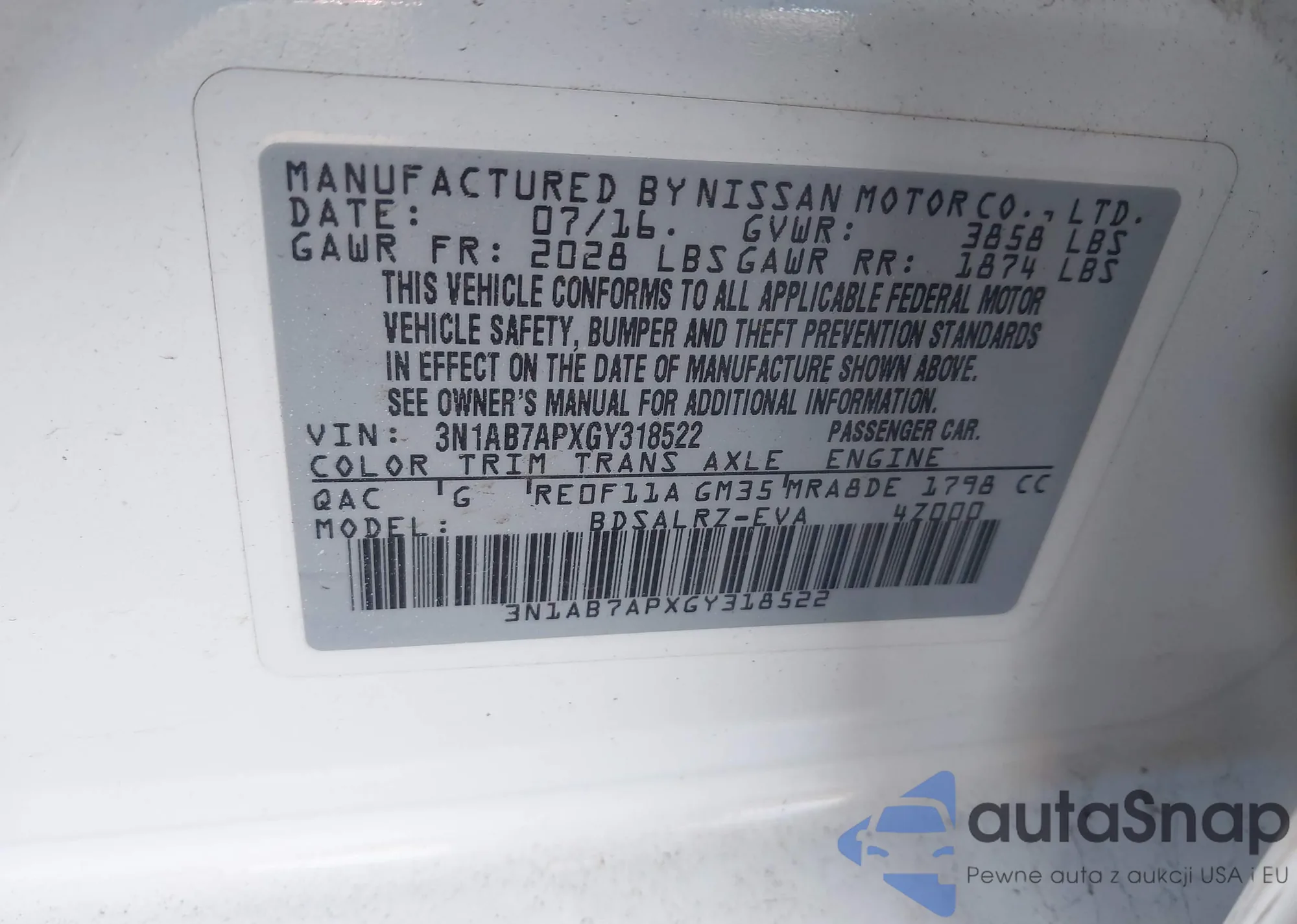 • VIN 3N1AB7APXGY318522