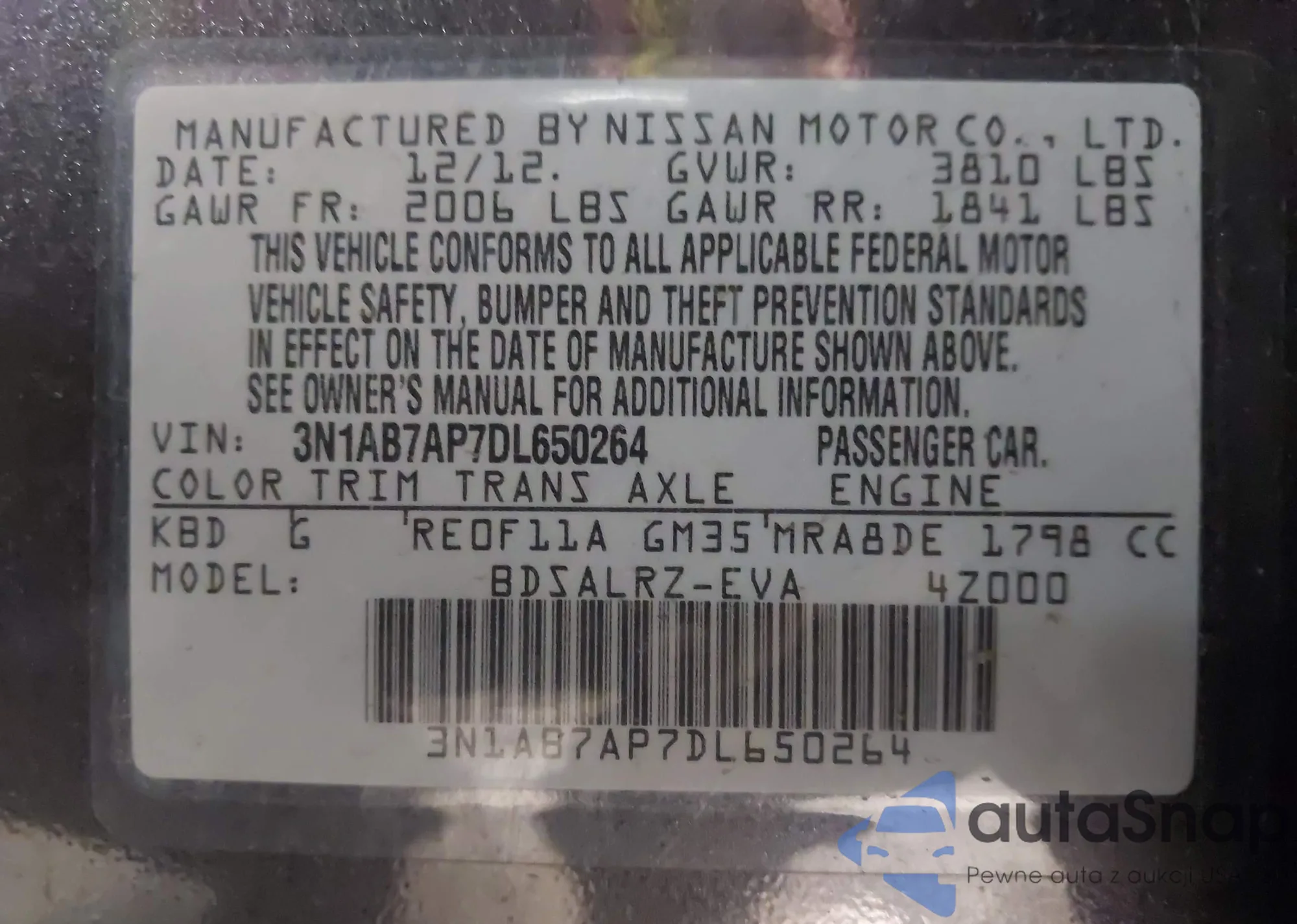 • VIN 3N1AB7AP7DL650264