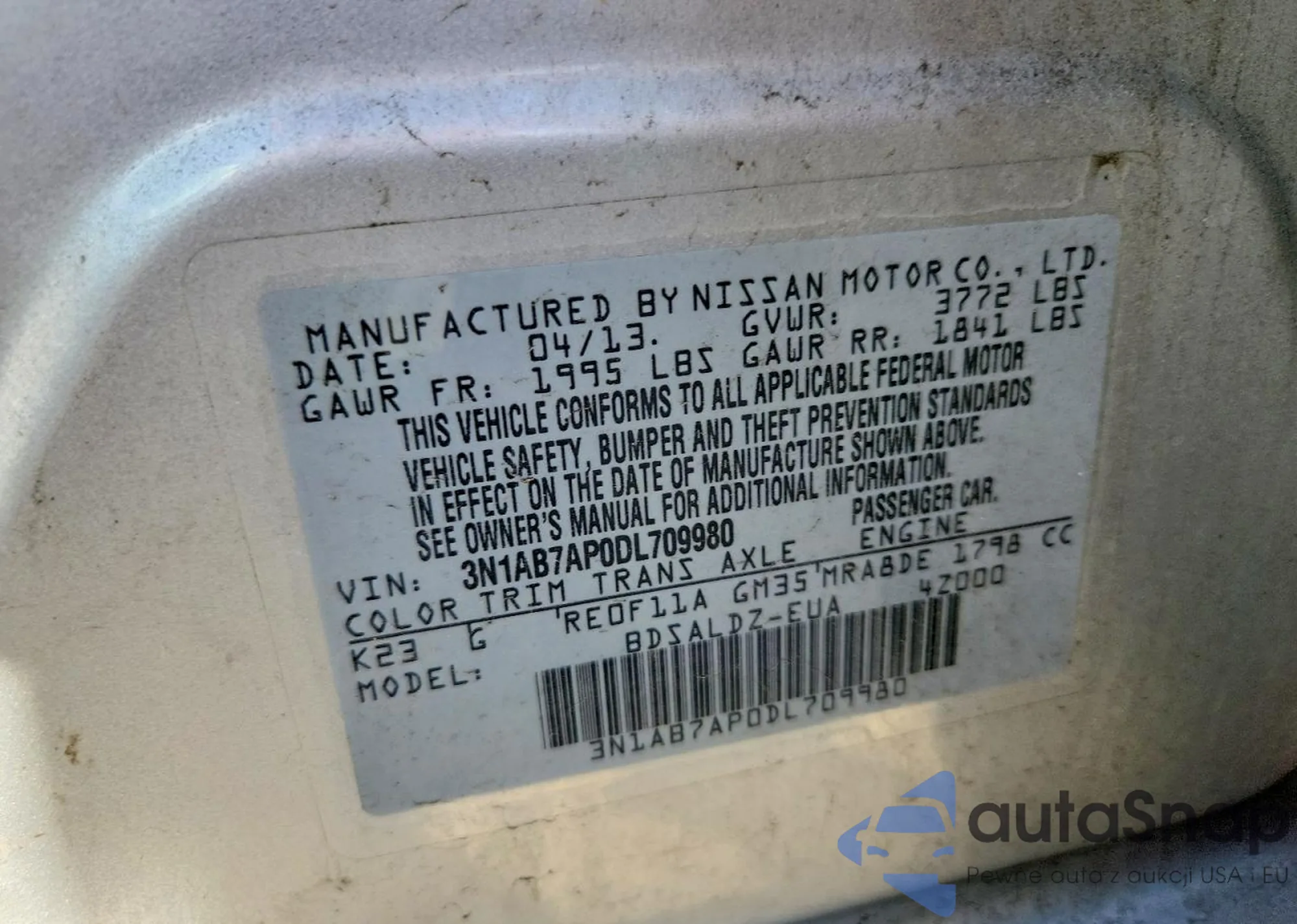 • VIN 3N1AB7AP0DL709980