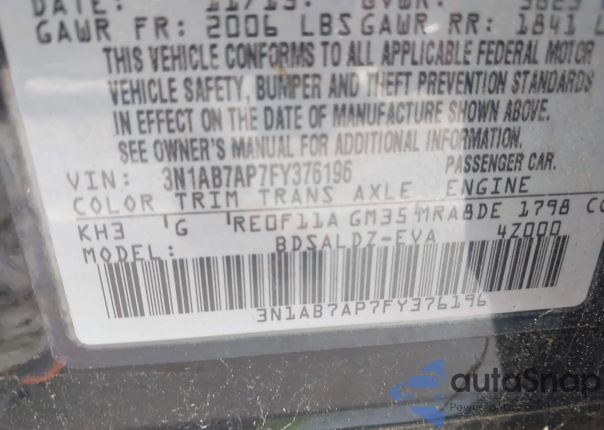 • VIN 3N1AB7AP7FY376196
