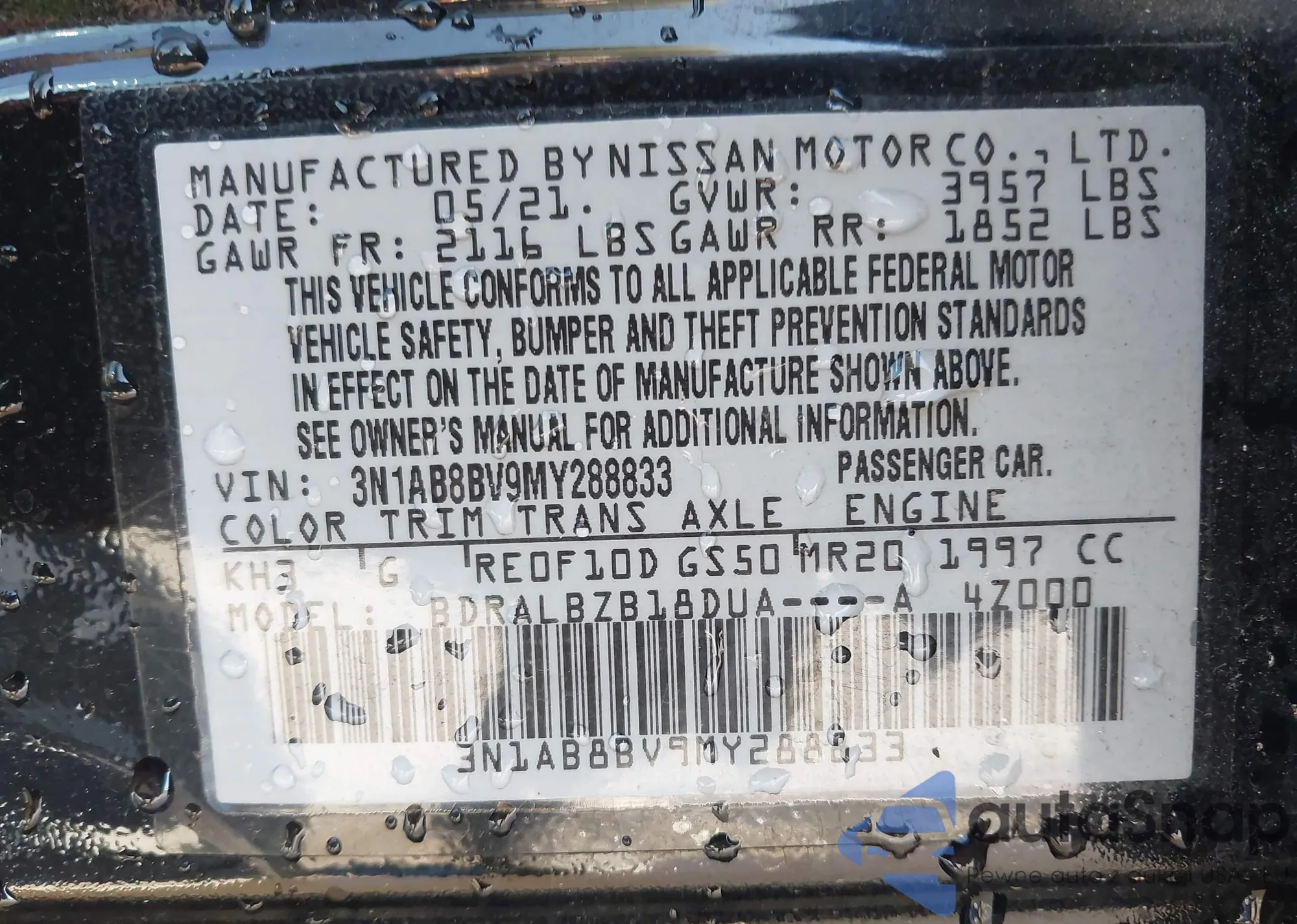 • VIN 3N1AB8BV9MY288833
