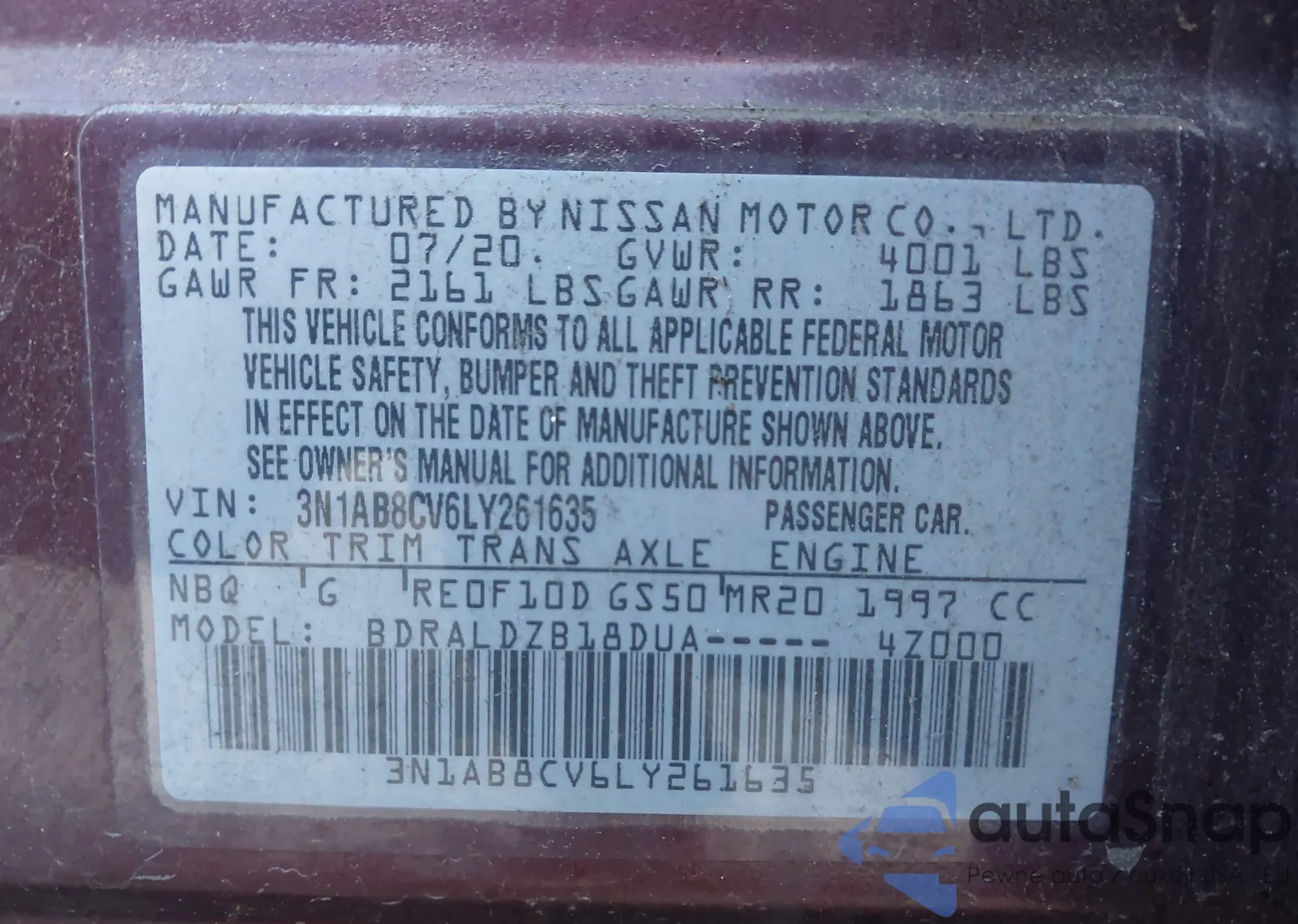 • VIN 3N1AB8CV6LY261635