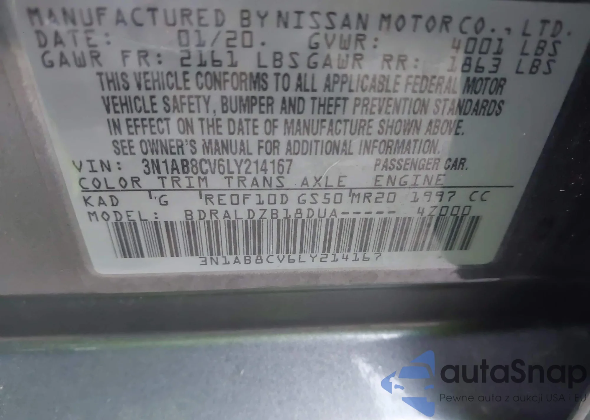• VIN 3N1AB8CV6LY214167