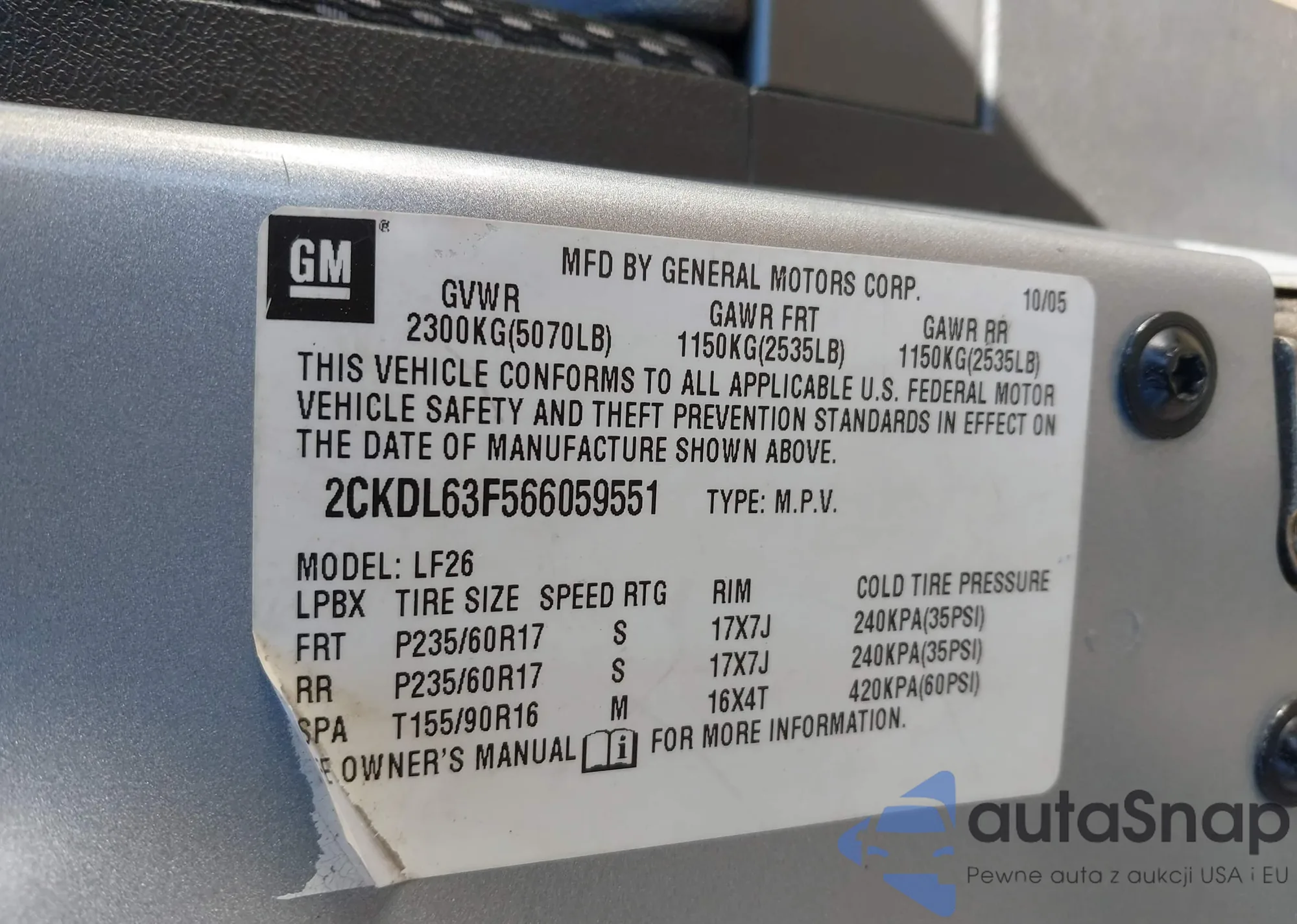 LOT: 44074007 VIN: 2CKDL63F976061207