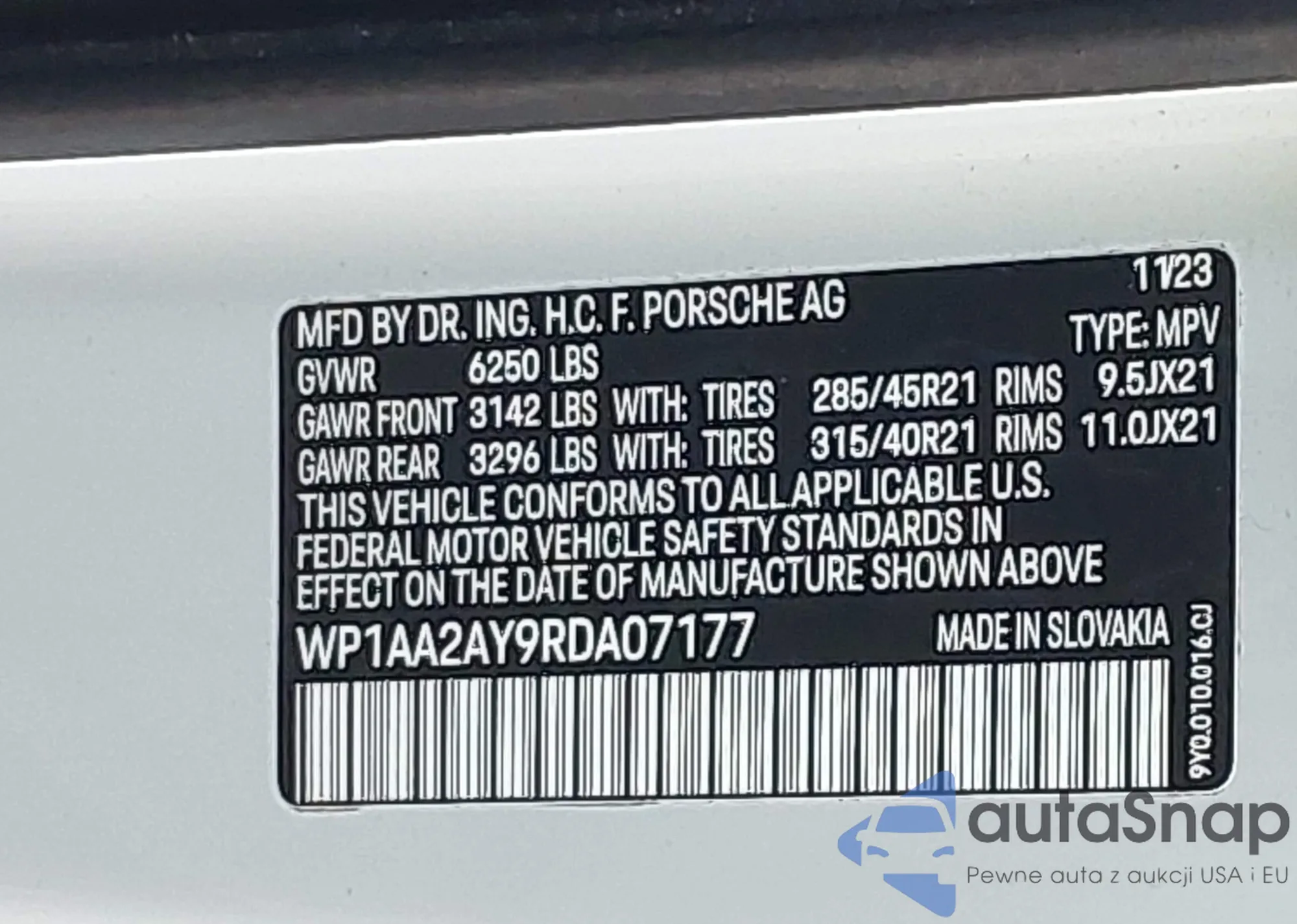 LOT: 42214029 VIN: WP1BA2AY8MDA43925