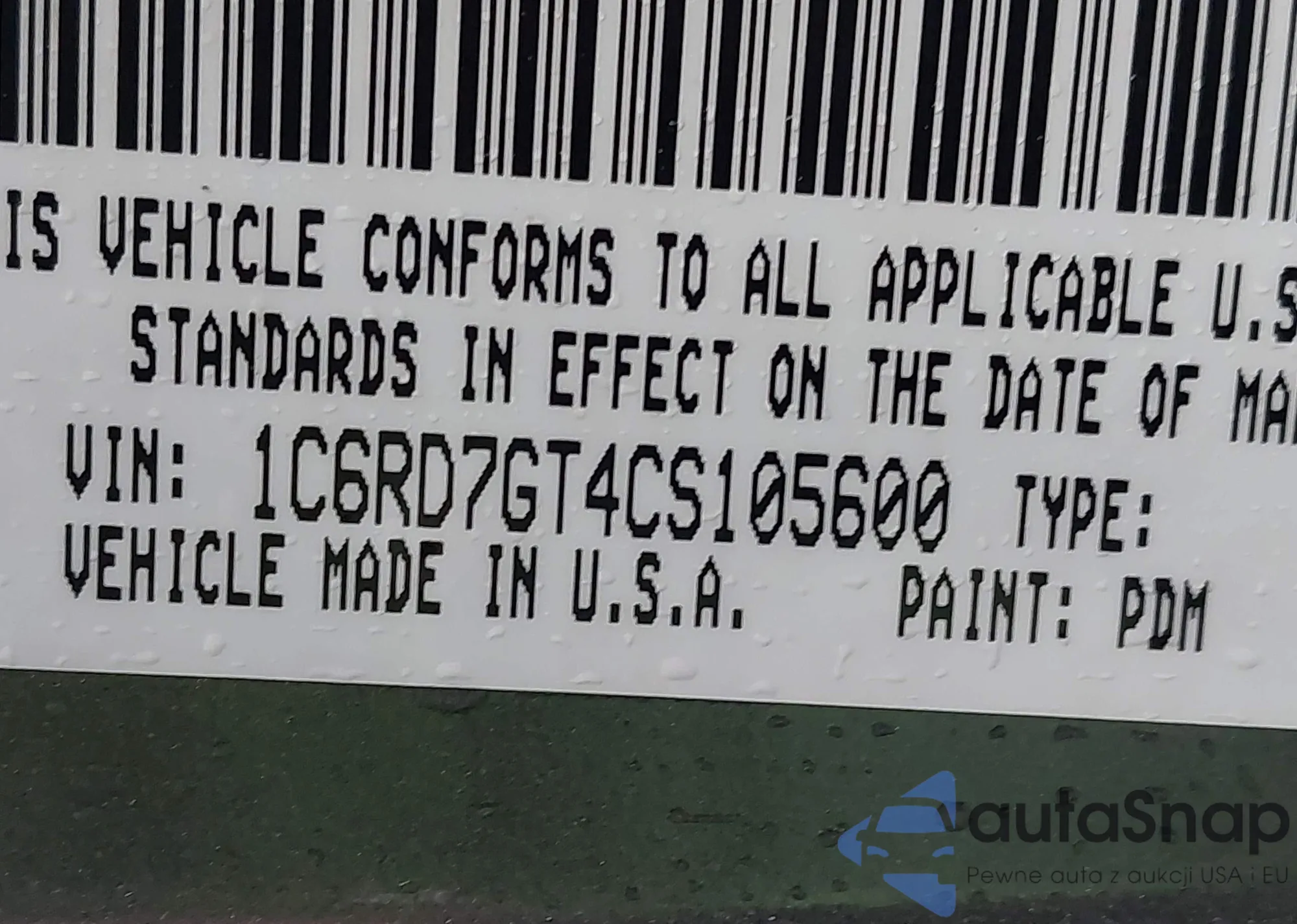 • VIN 1C6RD7GT4CS105600