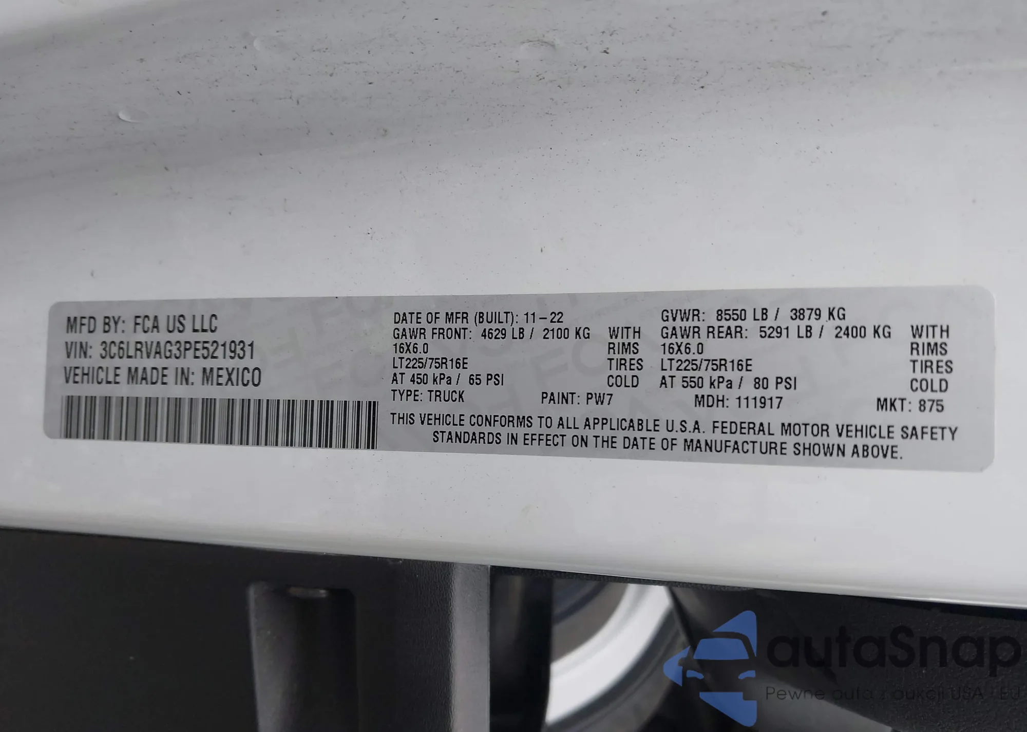 • VIN 3C6LRVAG3PE521931