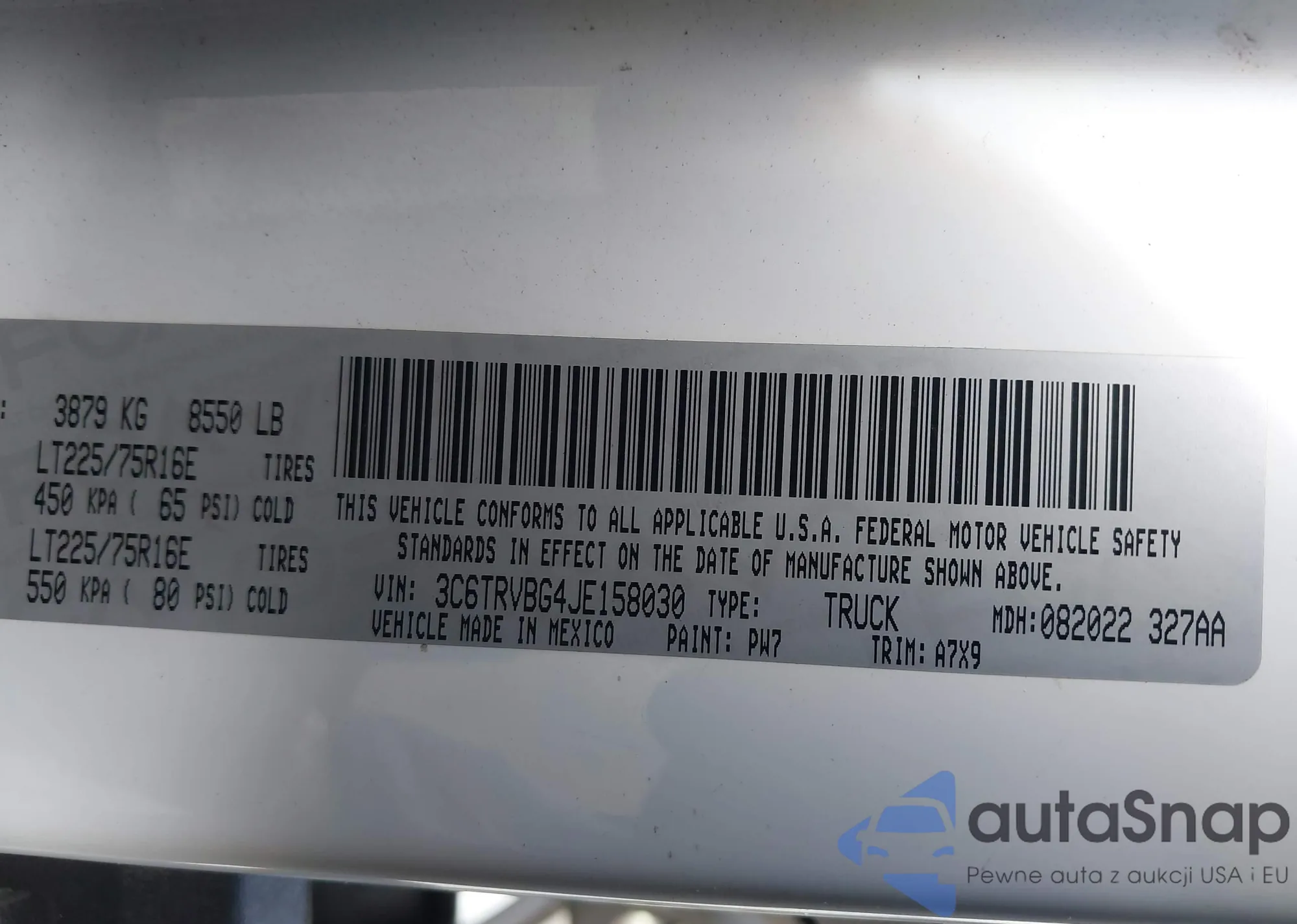 • VIN 3C6TRVBG4JE158030