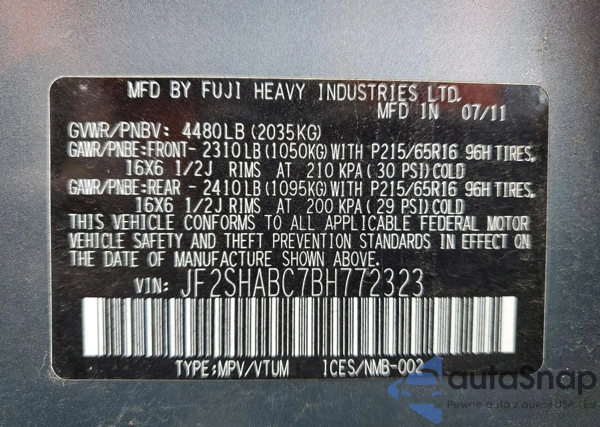• VIN JF2SHABC7BH772323