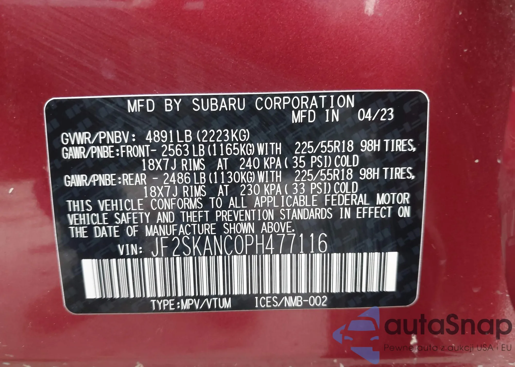 LOT: 76017645 VIN: JF2SKAMC2PH533641