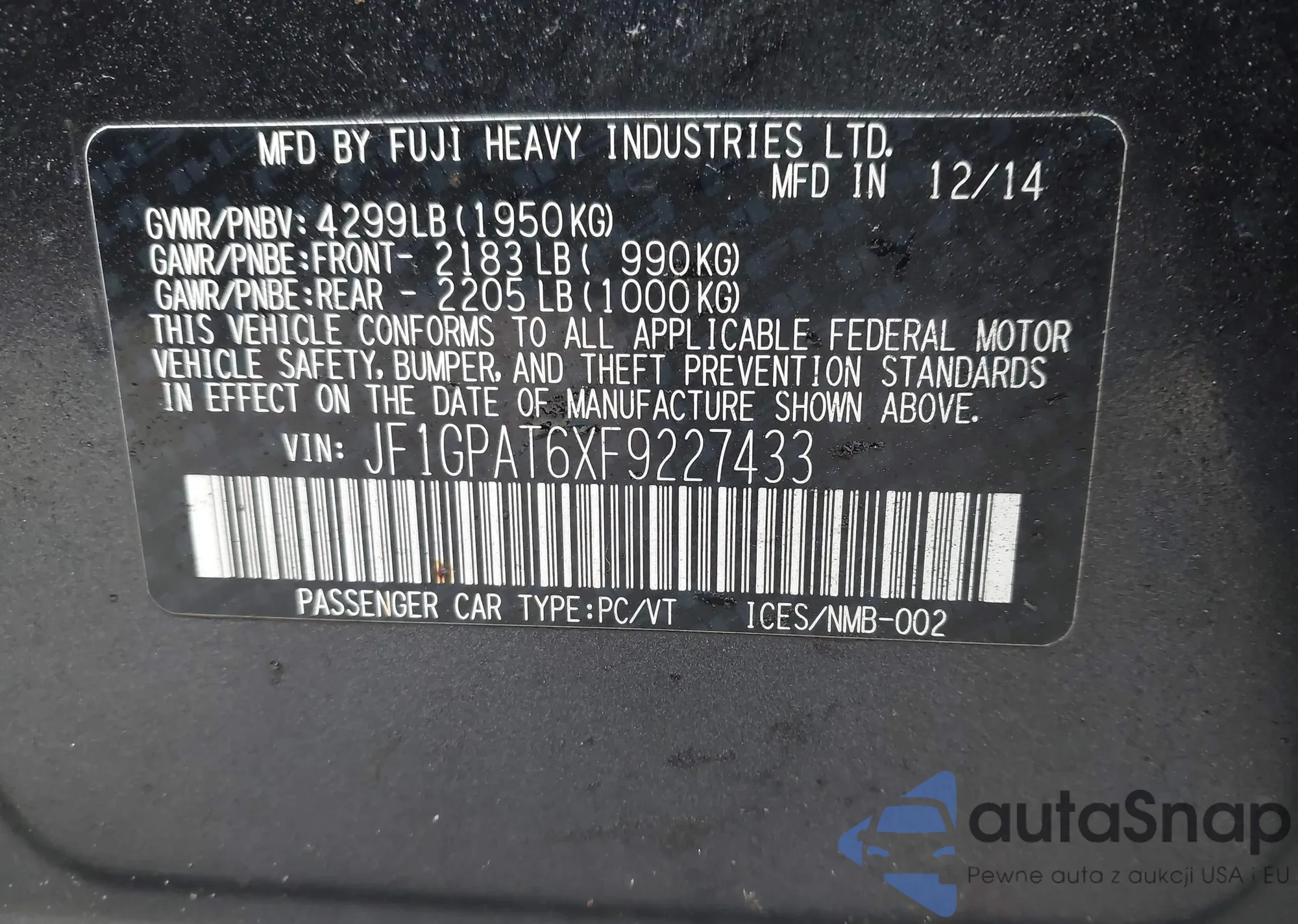 • VIN JF1GPAT6XF9227433