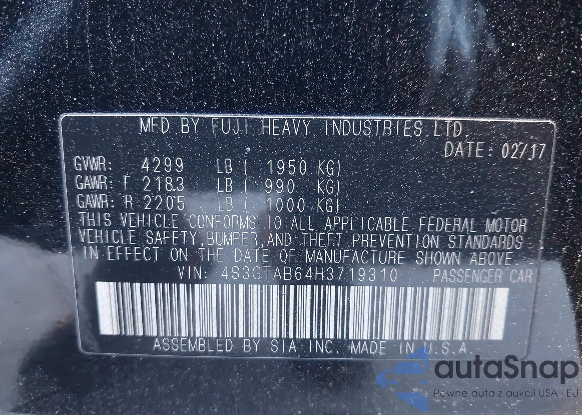 • VIN 4S3GTAB64H3719310