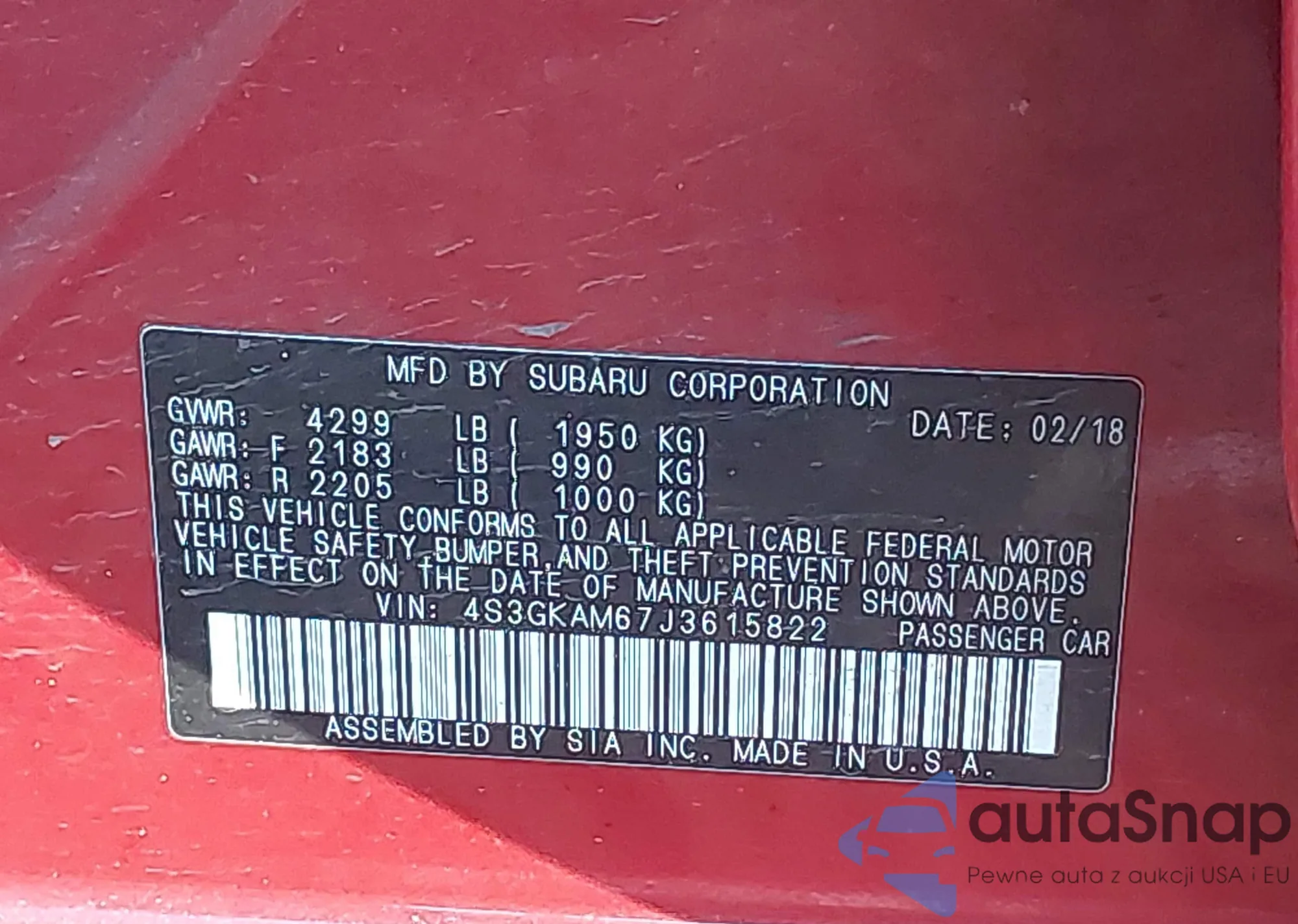 • VIN 4S3GKAM67J3615822