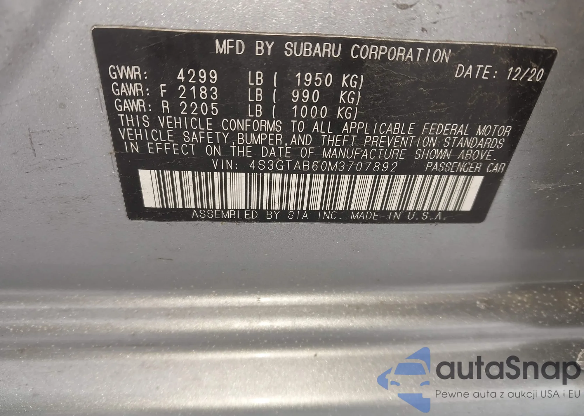 • VIN 4S3GTAB60M3707892