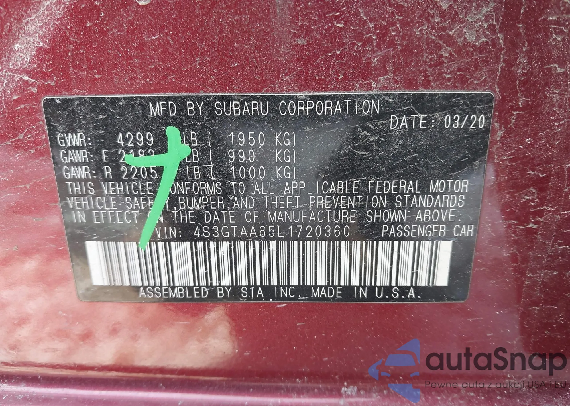 • VIN 4S3GTAA65L1720360