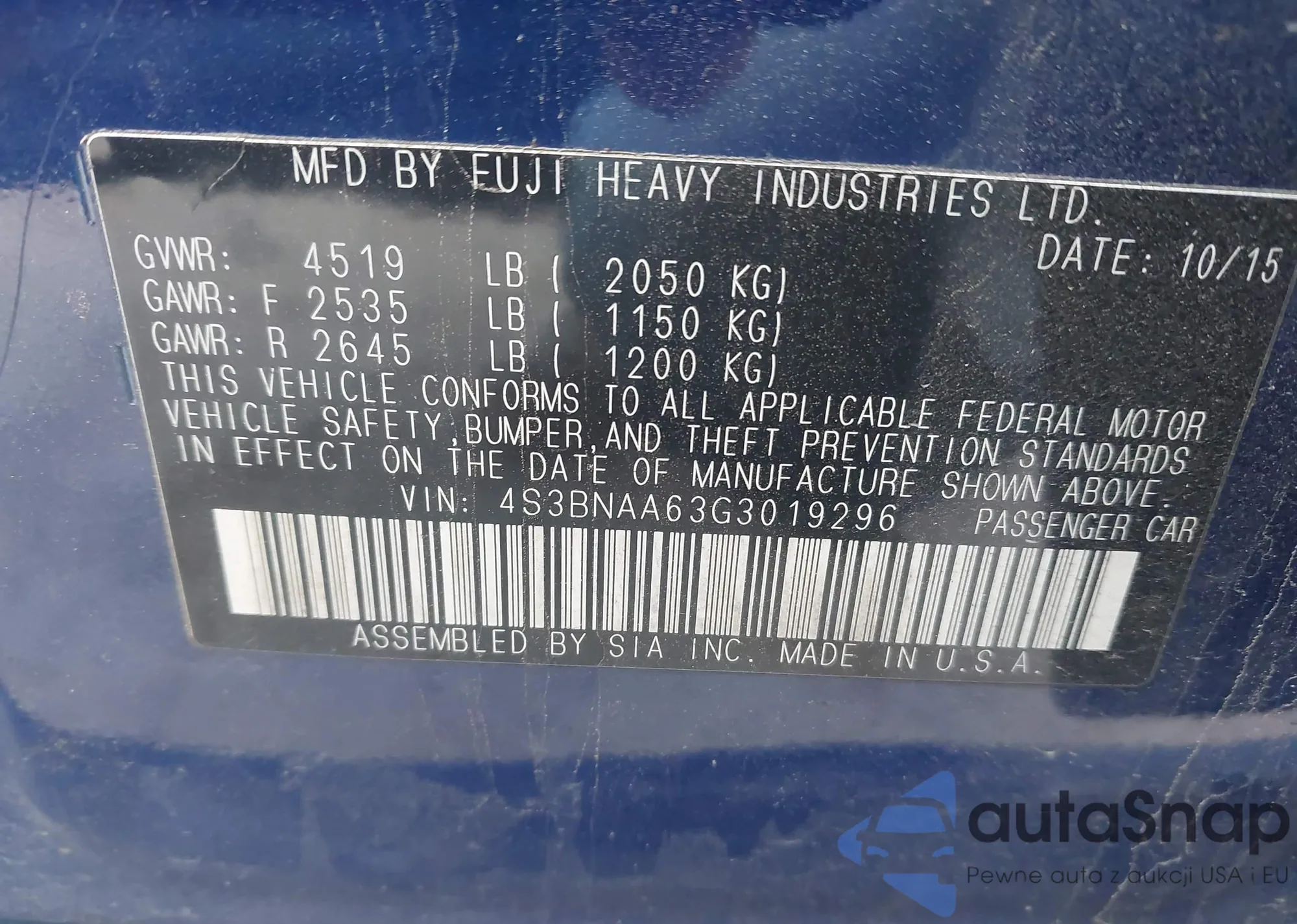 LOT: 43568067 VIN: 4S3BNAA63G3019296