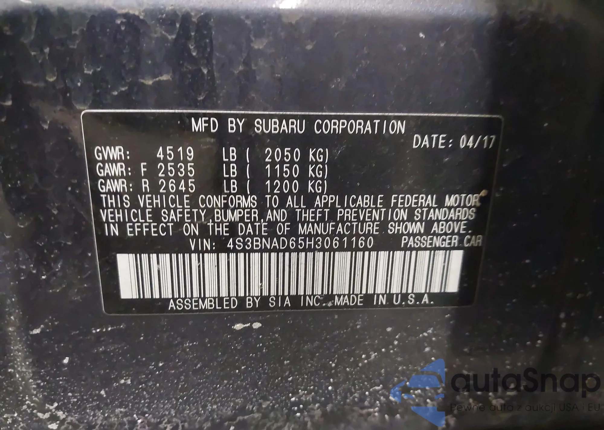 LOT: 43949314 VIN: 4S3BNAD65H3061160