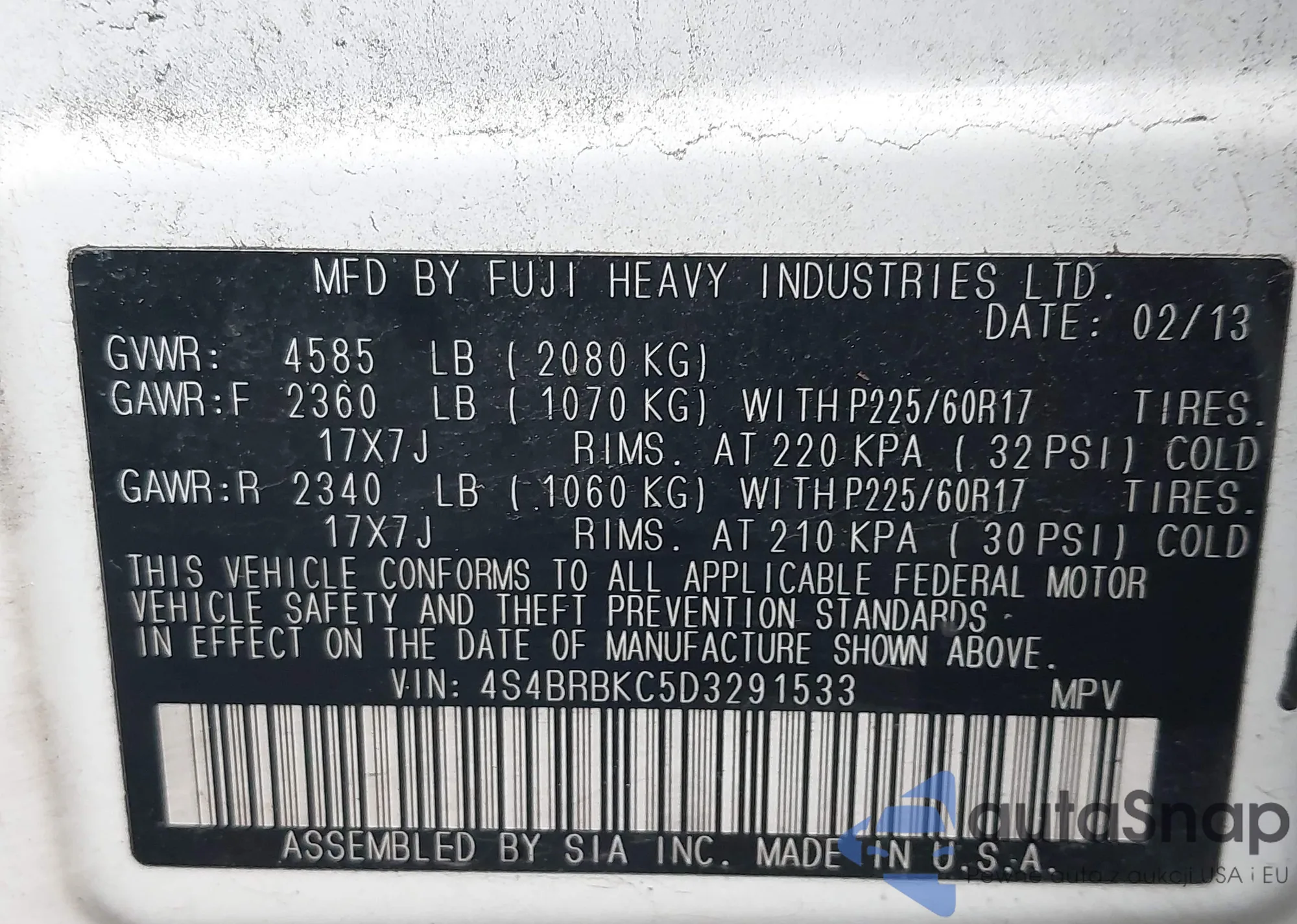 LOT: 44268184 VIN: 4S4BRBKC5D3291533