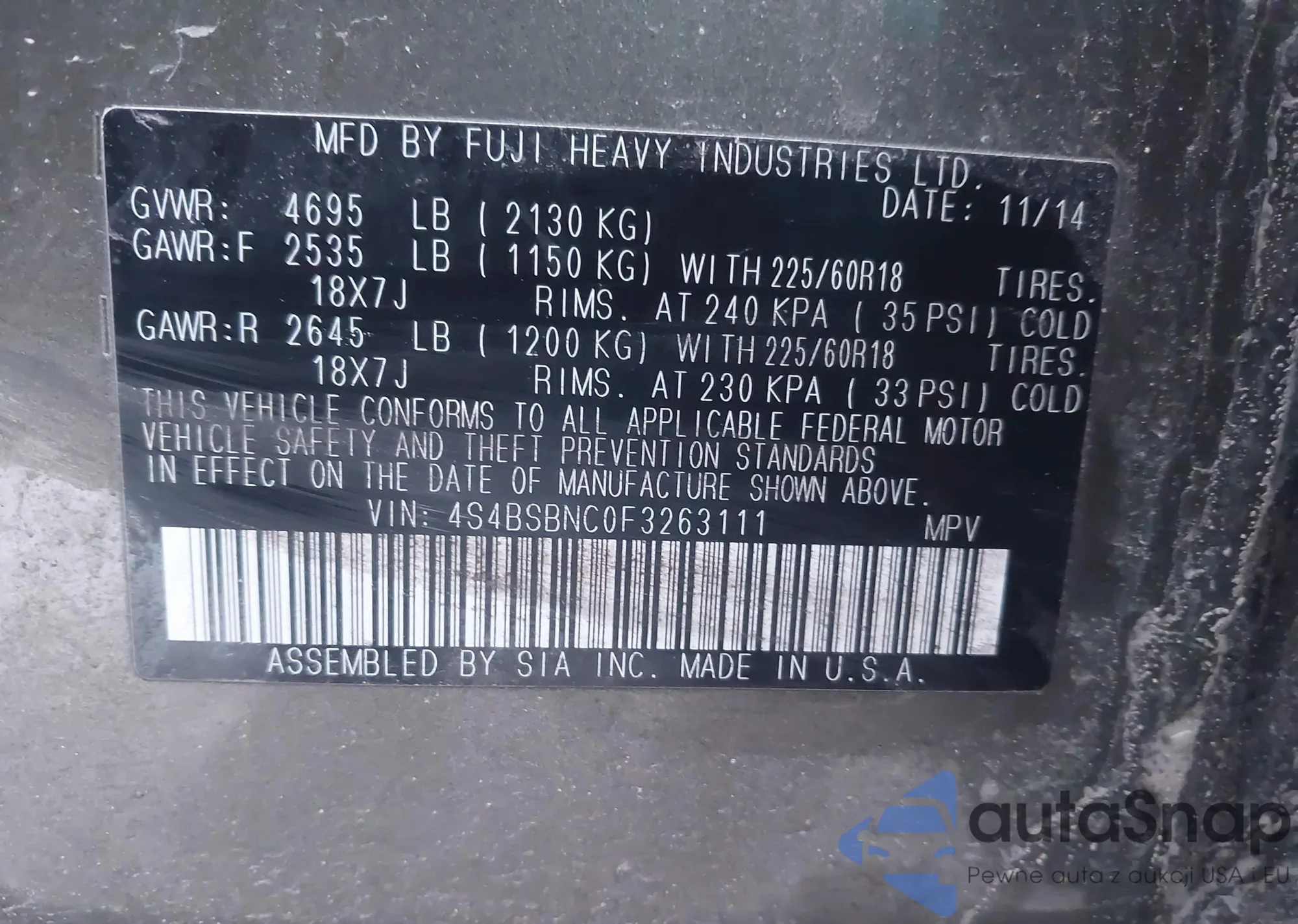 • VIN 4S4BSBNC0F3263111