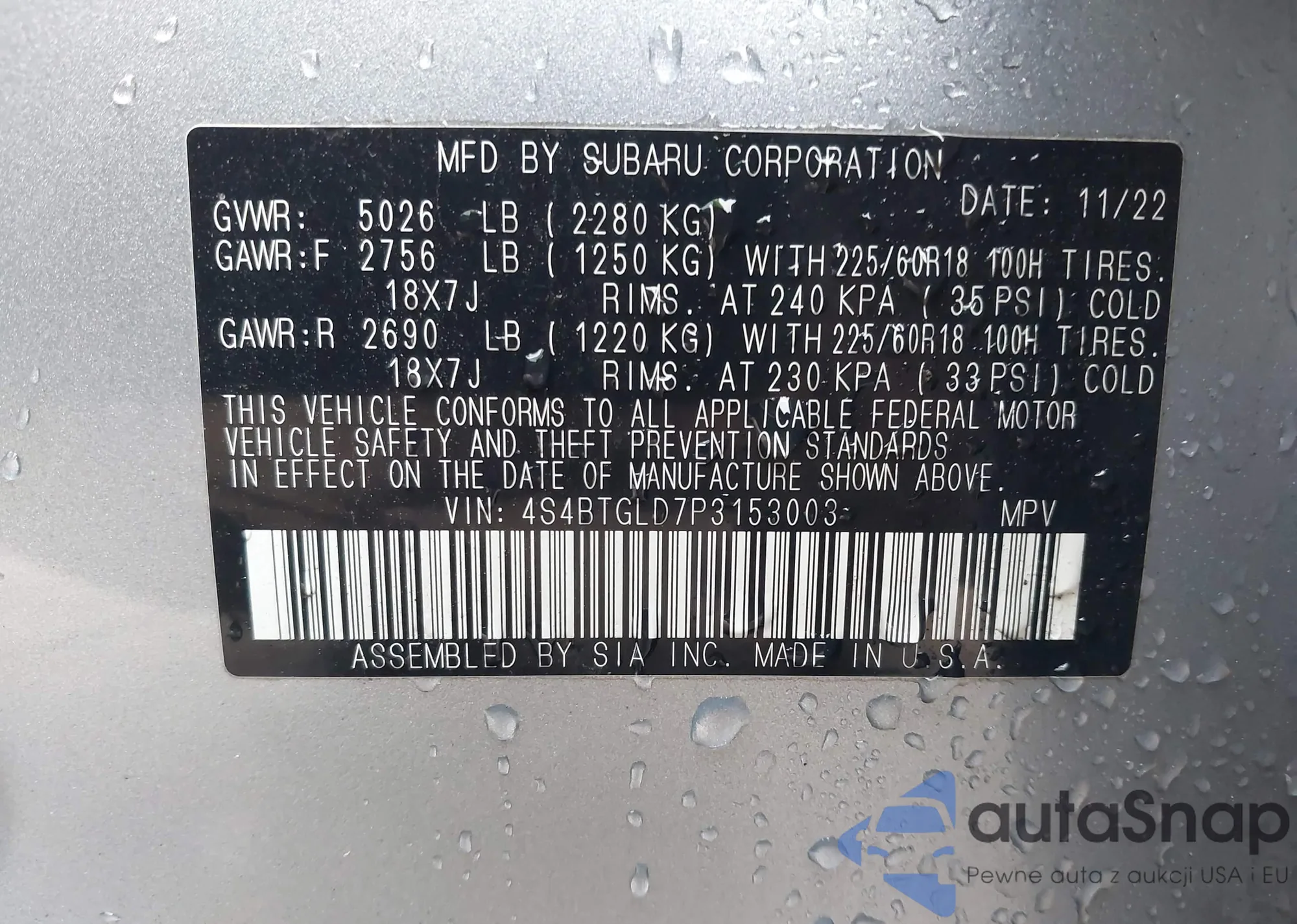 • VIN 4S4BTGLD7P3153003
