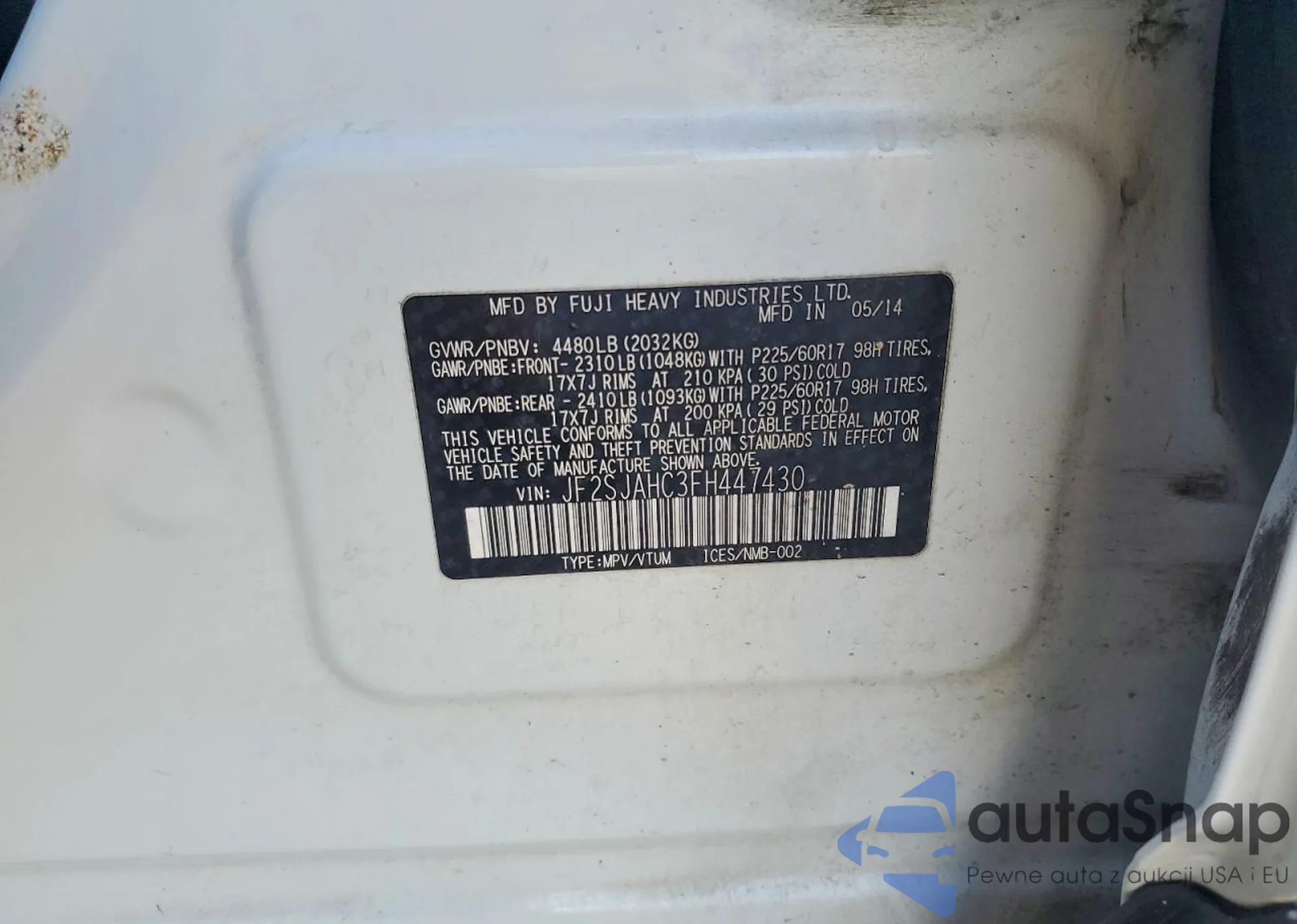 • VIN JF2SJAHC3FH447430