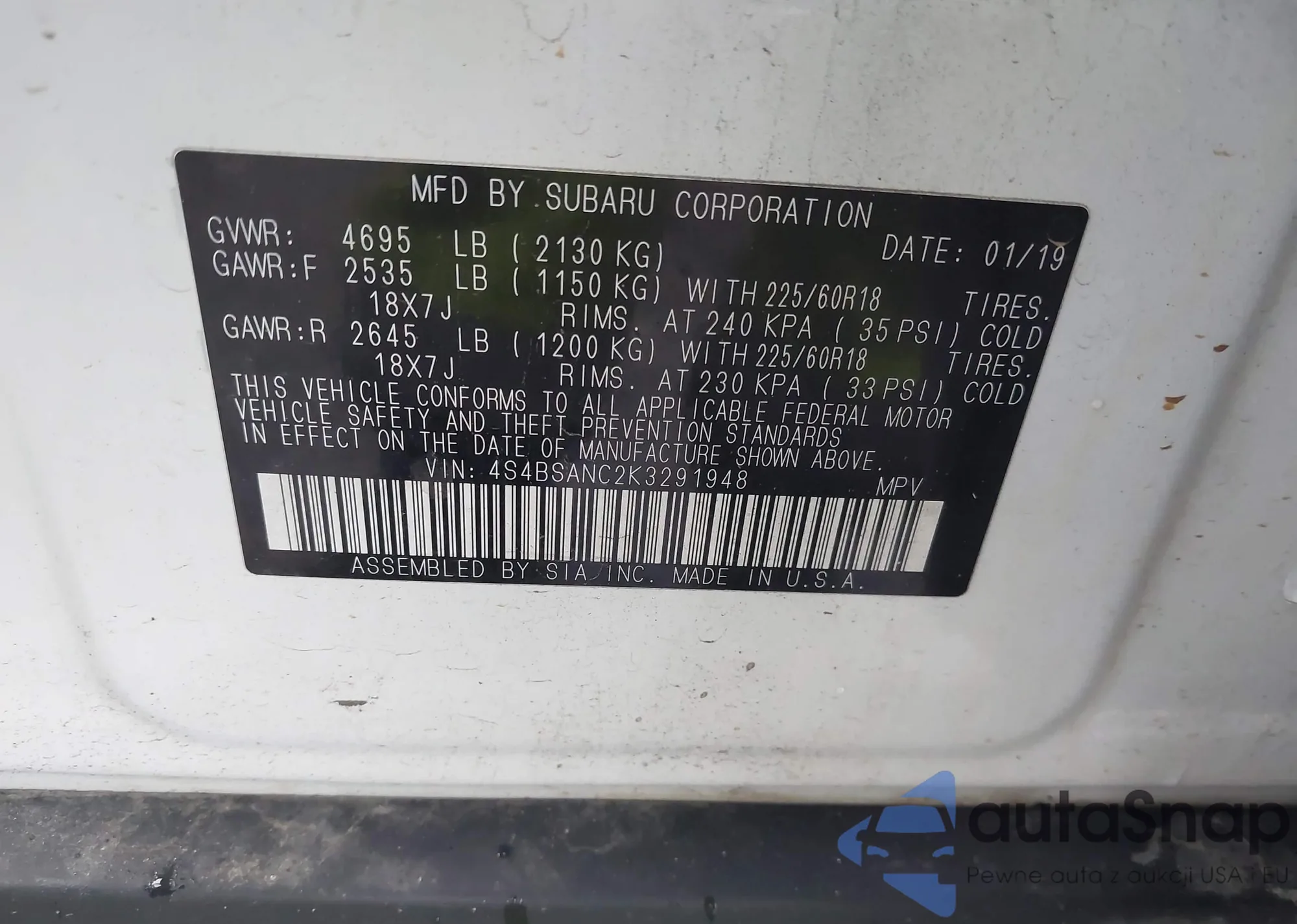 LOT: 44587722 VIN: 4S4BSANC2K3291948
