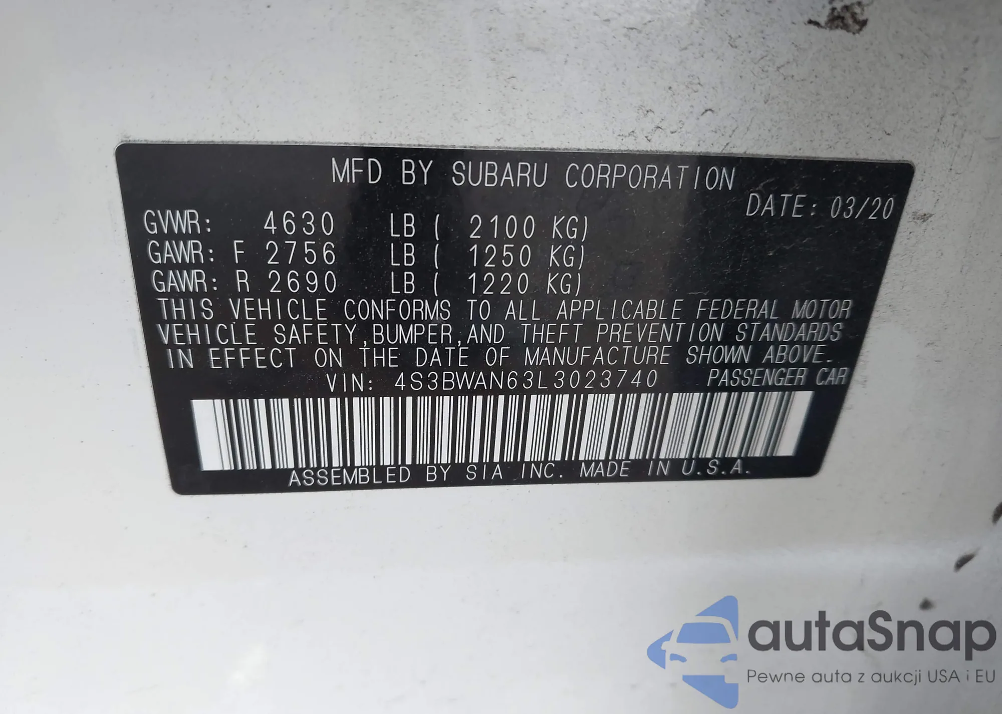 • VIN 4S3BWAN63L3023740
