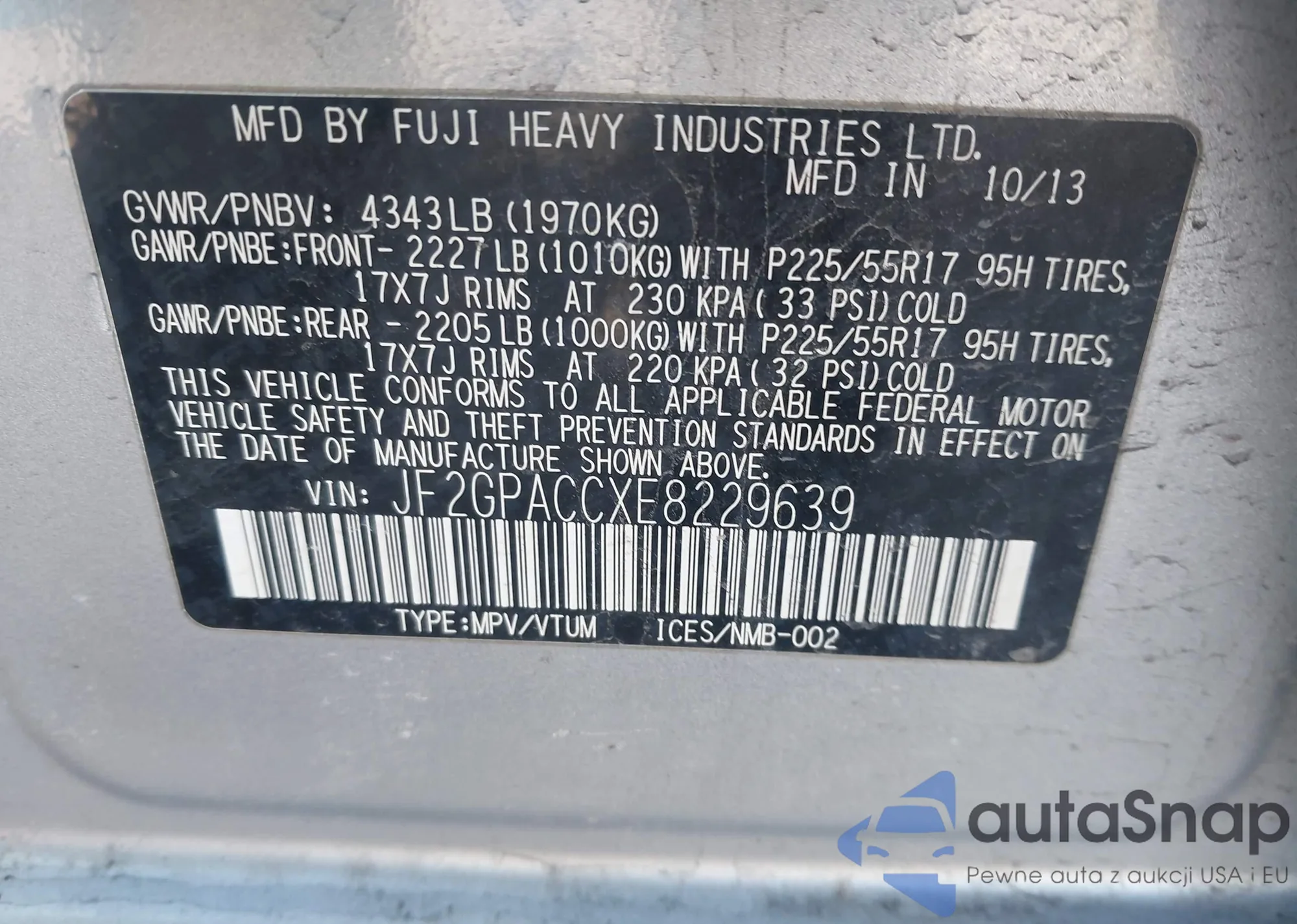 LOT: 44199145 VIN: JF2GPAVCXE8318995