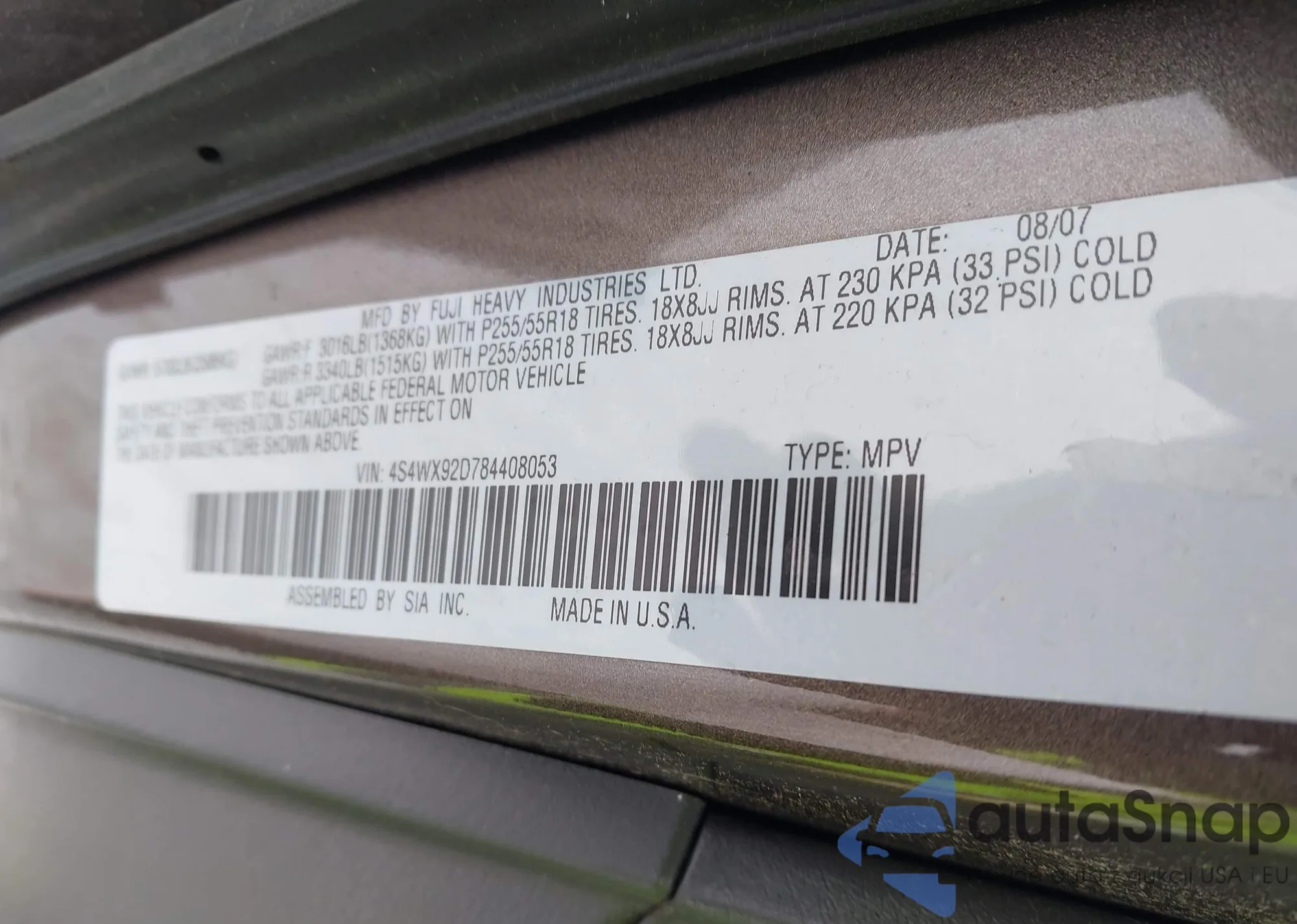 • VIN 4S4WX92D784408053