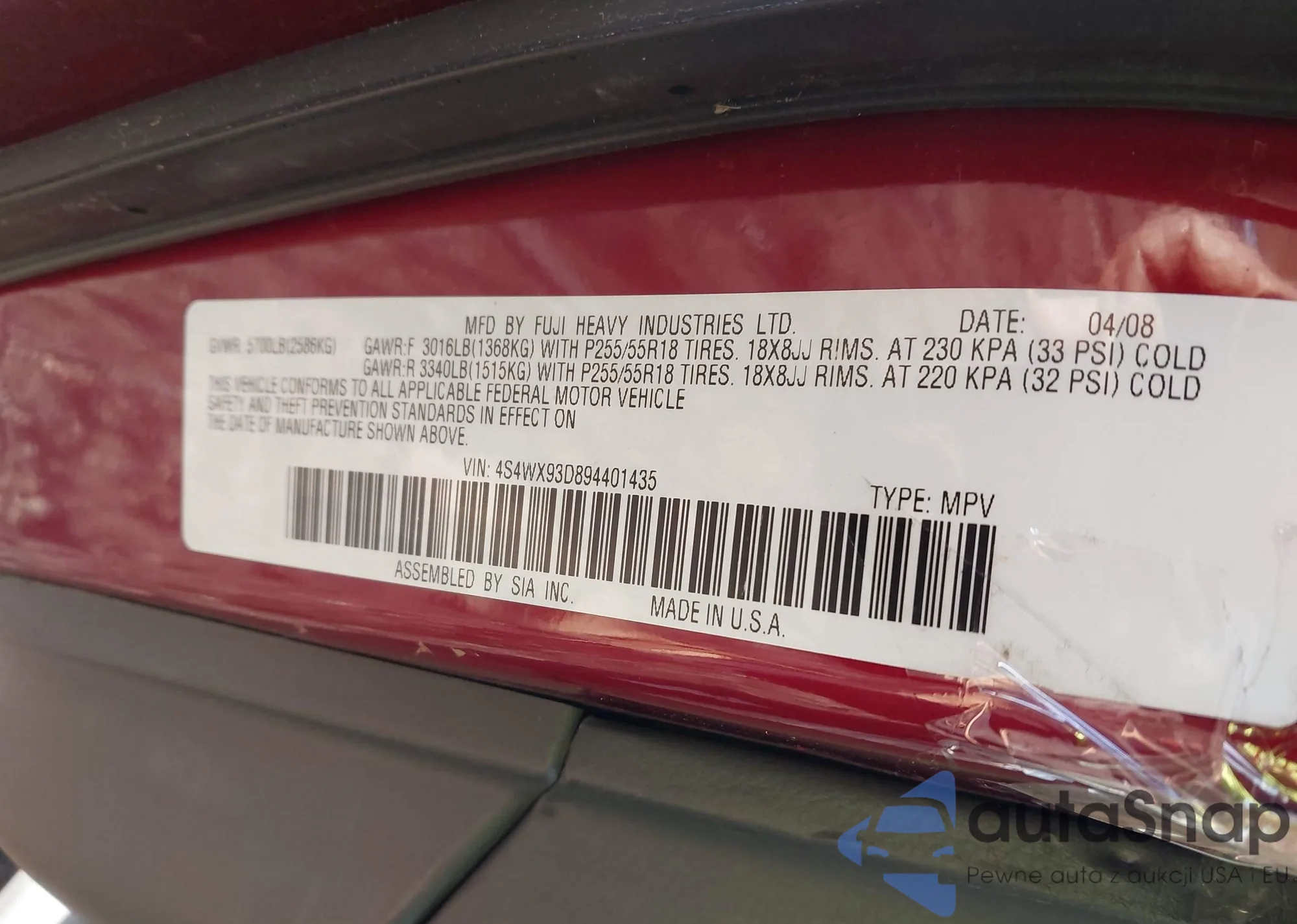 LOT: 44216836 VIN: 4S4WX93D894401435