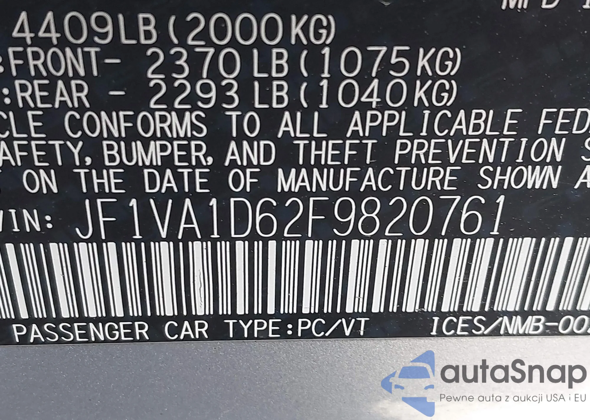 LOT: 44181365 VIN: JF1VA1D62F9820761