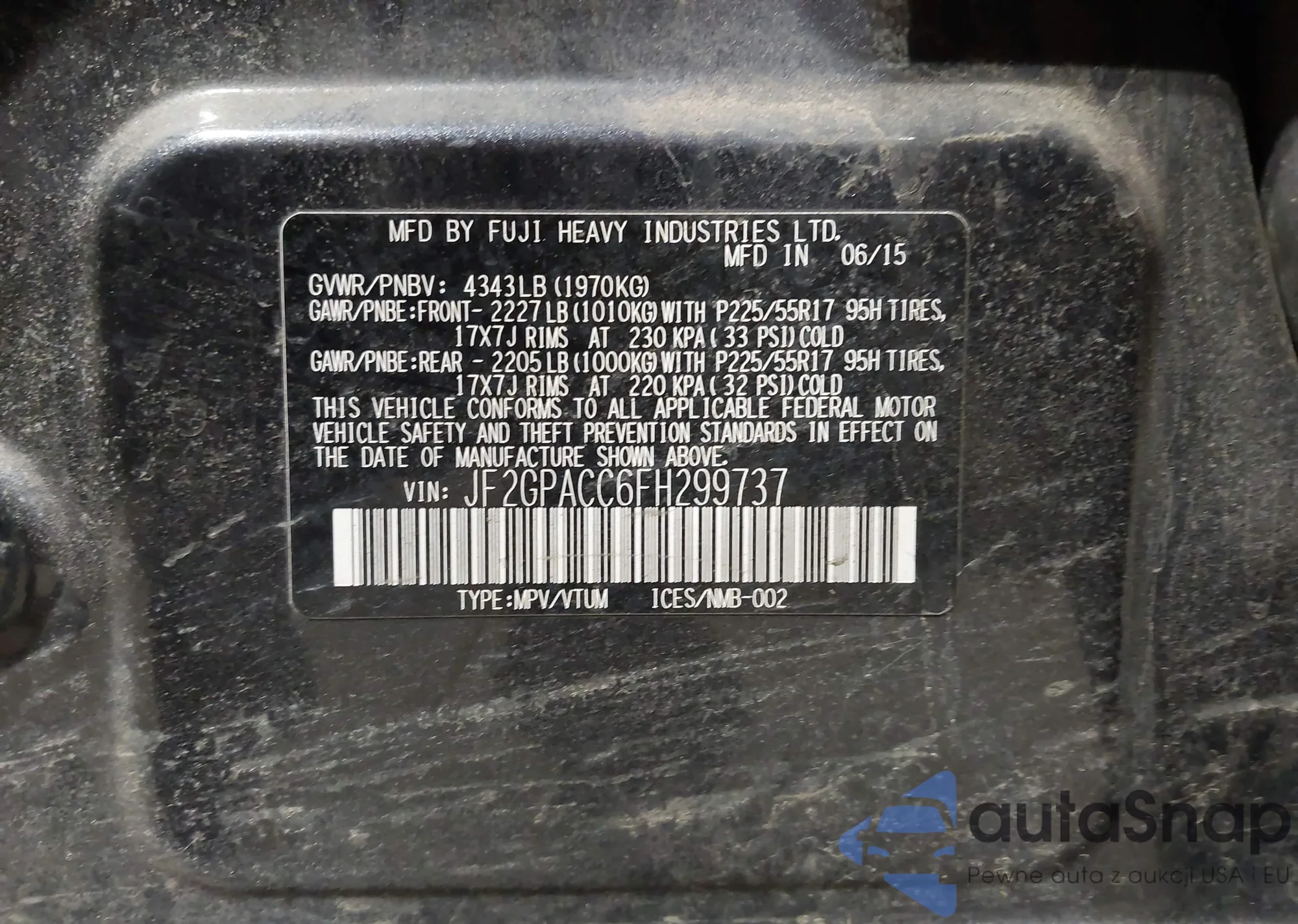LOT: 44284101 VIN: JF2GPACC6FH299737