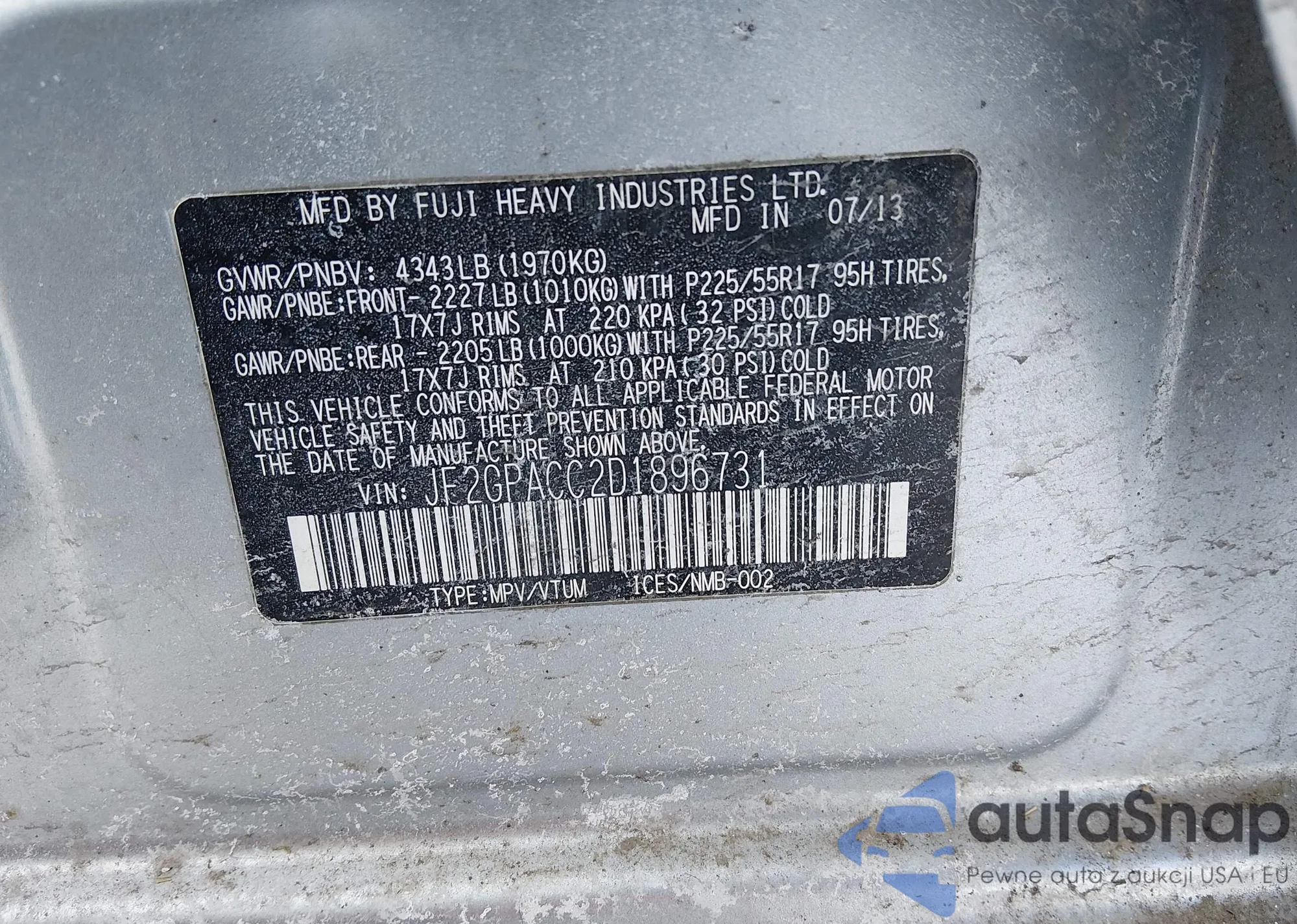 LOT: 44289754 VIN: JF2GPACC2D1896731