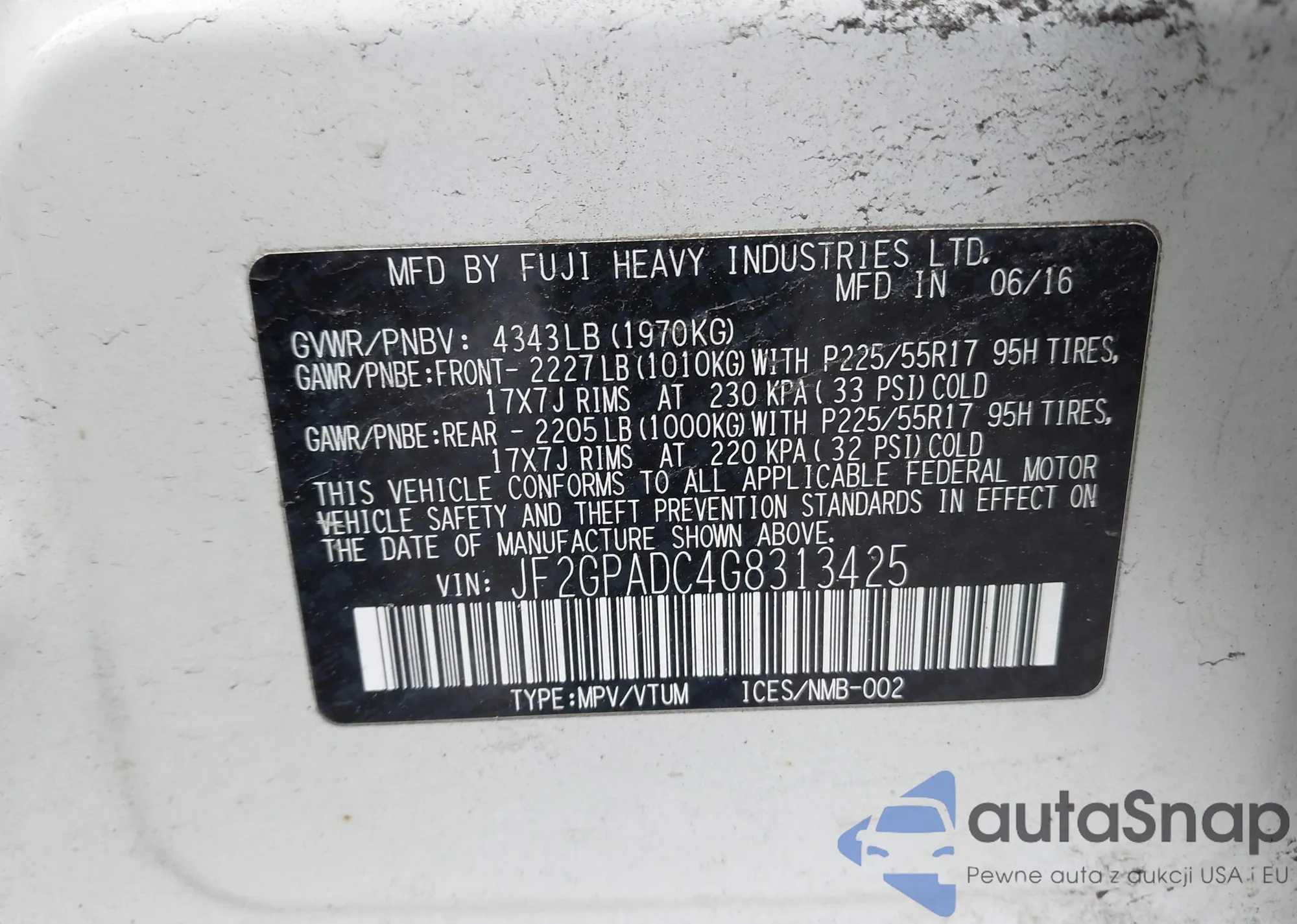 LOT: 44430500 VIN: JF2GPADC4G8313425