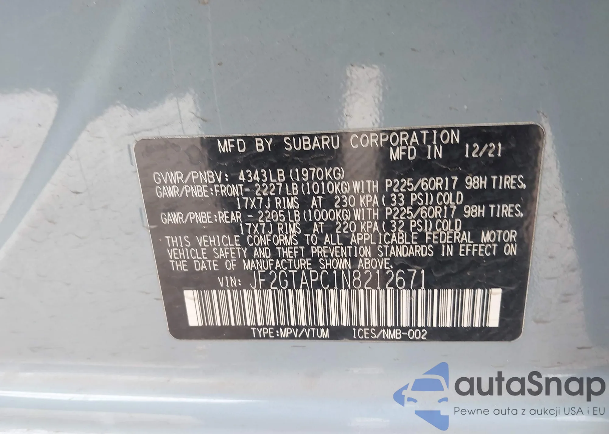 LOT: 43924873 VIN: JF2GTAPC1N8212671
