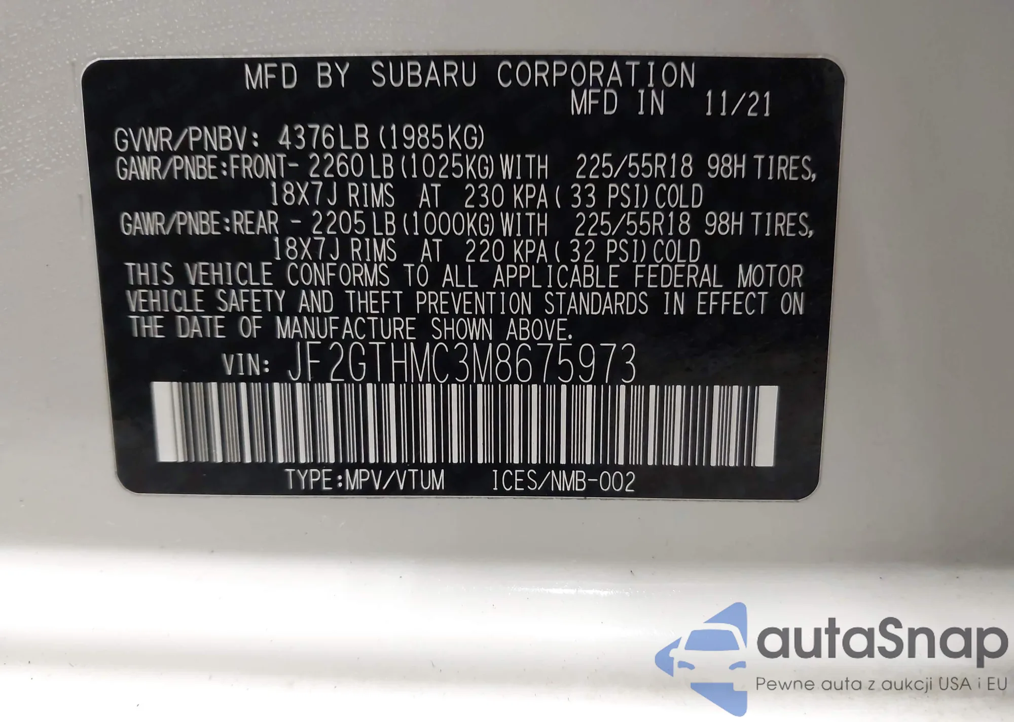 LOT: 43942970 VIN: JF2GTHMC3M8675973