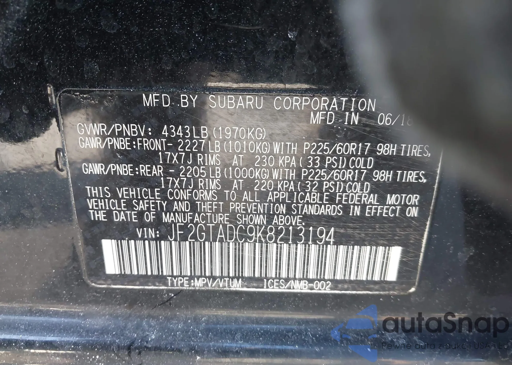 LOT: 44291486 VIN: JF2GTADC9K8213194