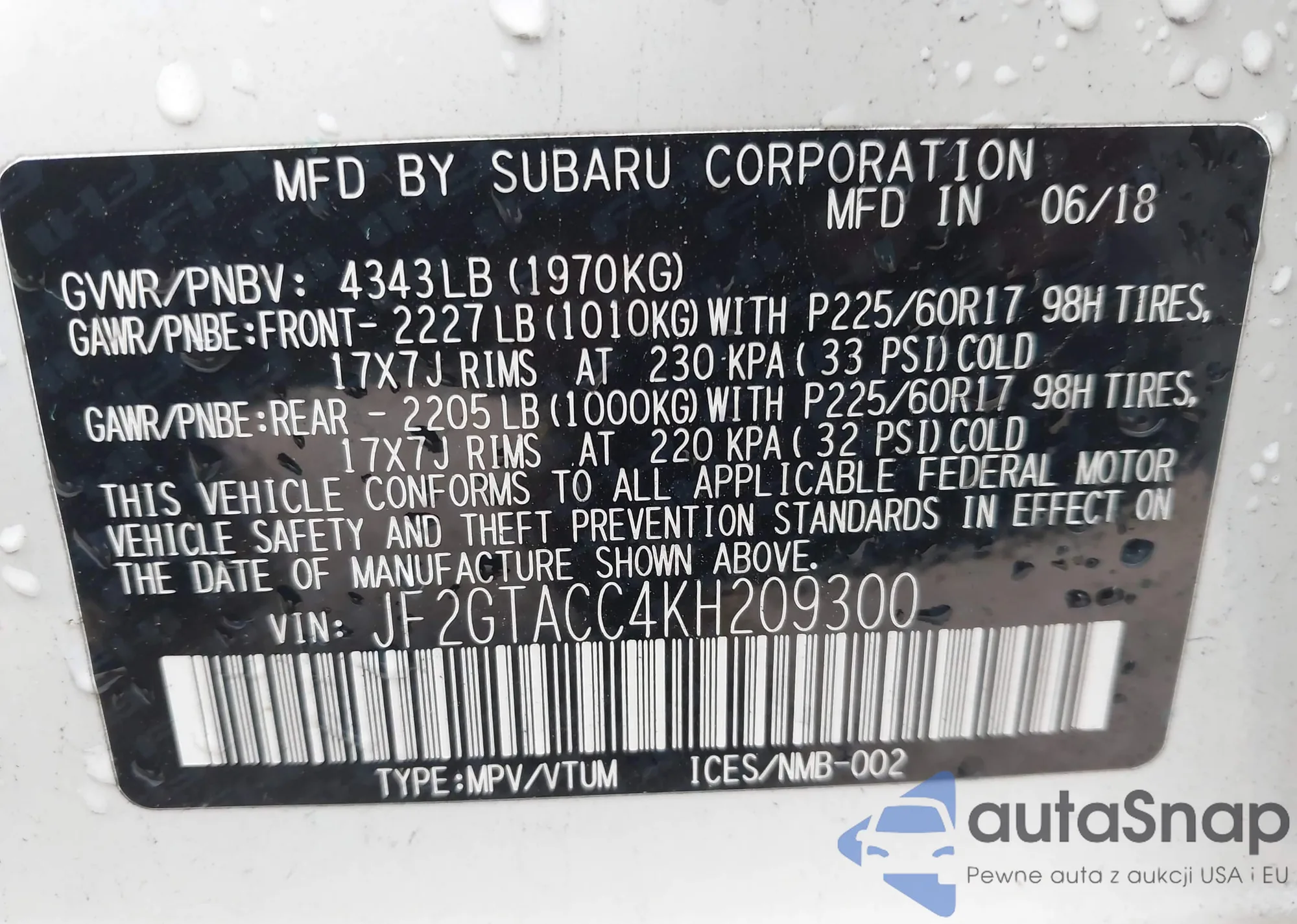 • VIN JF2GTACC4KH209300